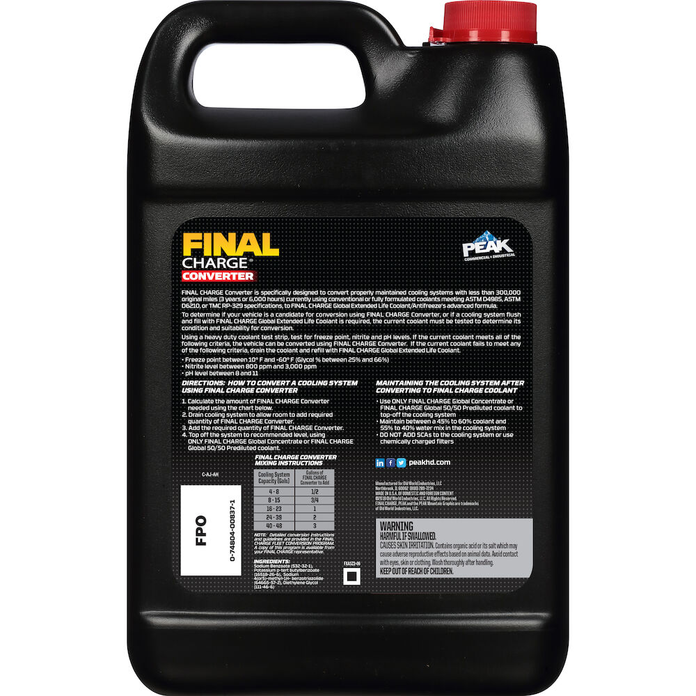 FINAL CHARGE® Converter is specifically designed to convert properly maintained conventional or fully-formulated coolants to the performance level of FINAL CHARGE Global Extended Life coolant by introducing the proper concentration of proprietary organic inhibitors to the cooling system.