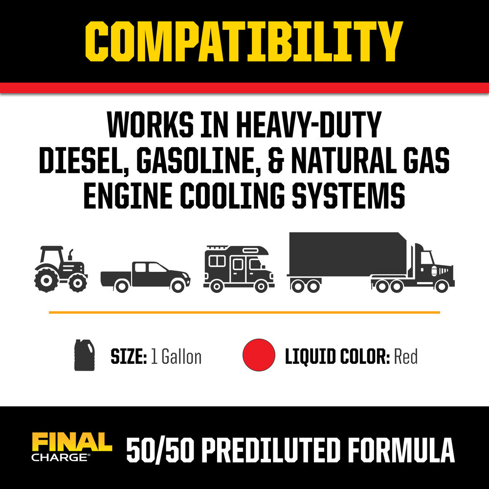 FINAL CHARGE® Global Full Strength Extended Life Coolant/Antifreeze is an Organic Acid Technology (OAT), globally formulated, ethylene glycol-based coolant, which uses organic acid inhibitors (non-2-EH) to provide guaranteed protection for all cooling system metals. With proper maintenance,† Final Charge Global Extended Life Coolant/Antifreeze delivers guaranteed cooling system protection for ONE MILLION MILES of on-road use (8 years or 20,000 hours of off-road use) without the use of Supplemental Coolant Additives (SCAs). Final Charge Global Extended Life Coolant/Antifreeze is nitrite-free, phosphate-free, silicate-free, and borate-free.