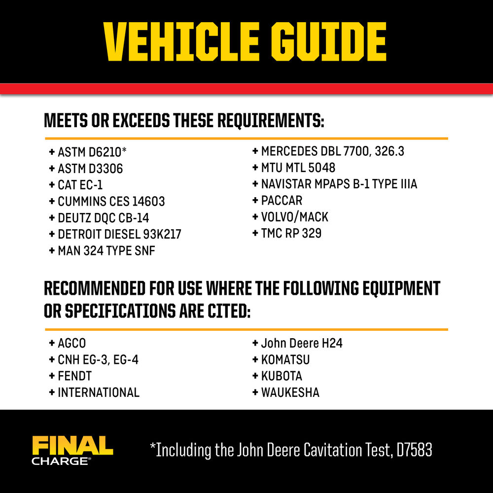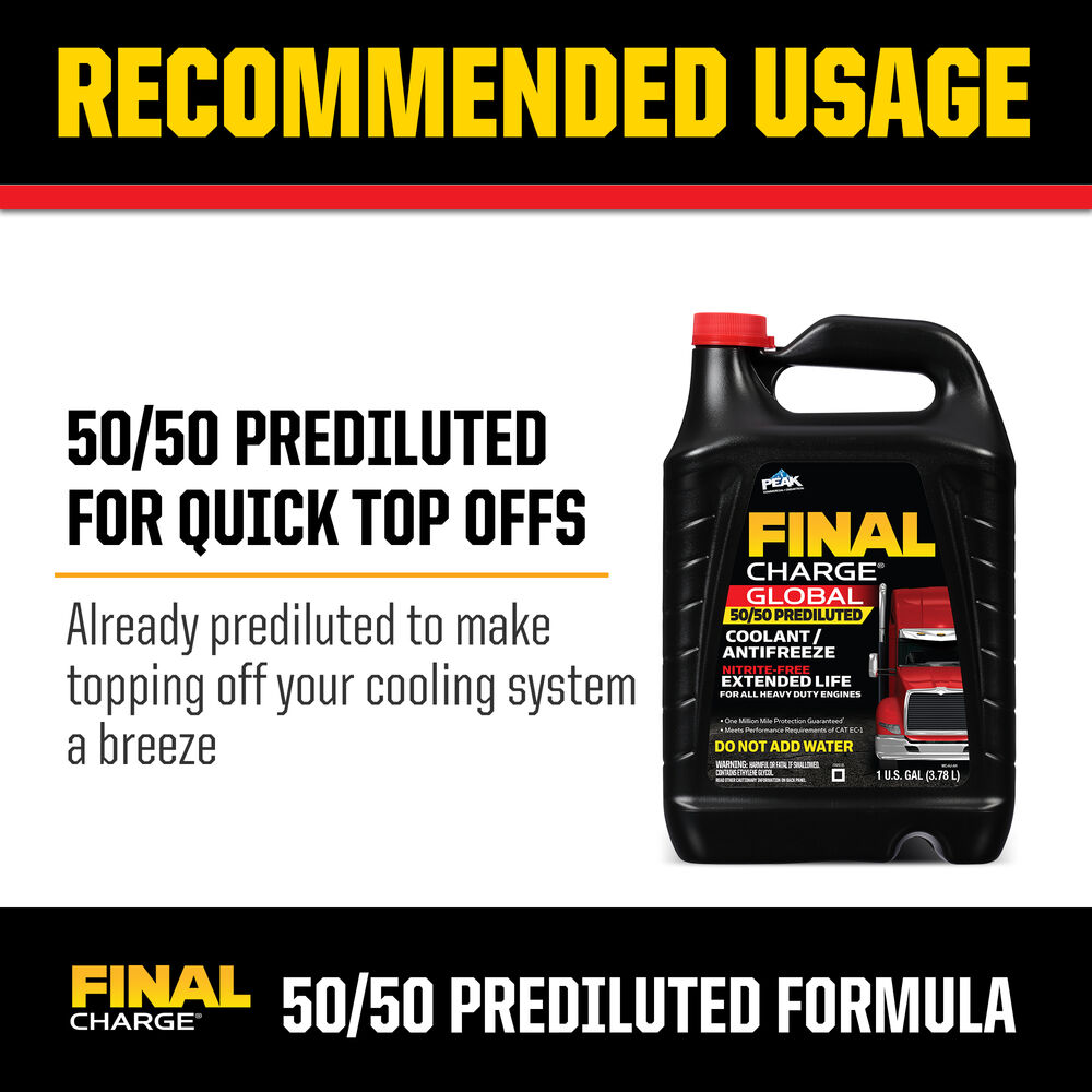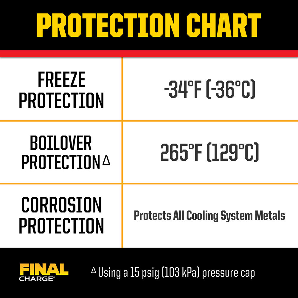 † Proper maintenance requires a complete cooling system flush and fill – and subsequent topping off, as needed – with Final Charge Global Extended Life 50/50 Pre-diluted Coolant/Antifreeze or Final Charge Global Extended Life Coolant/Antifreeze and water. For guaranteed protection, no other products or product supplements may be used.