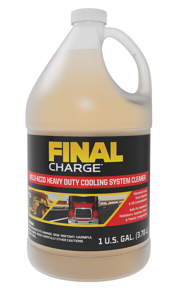 FINAL CHARGE® Mild-Acid Heavy Duty Cooling System Cleaner is effective in removing heavy rust, scale, system deposits, oil, and fuel contamination from engine coolant systems.