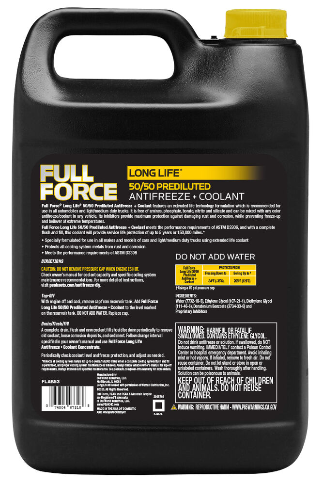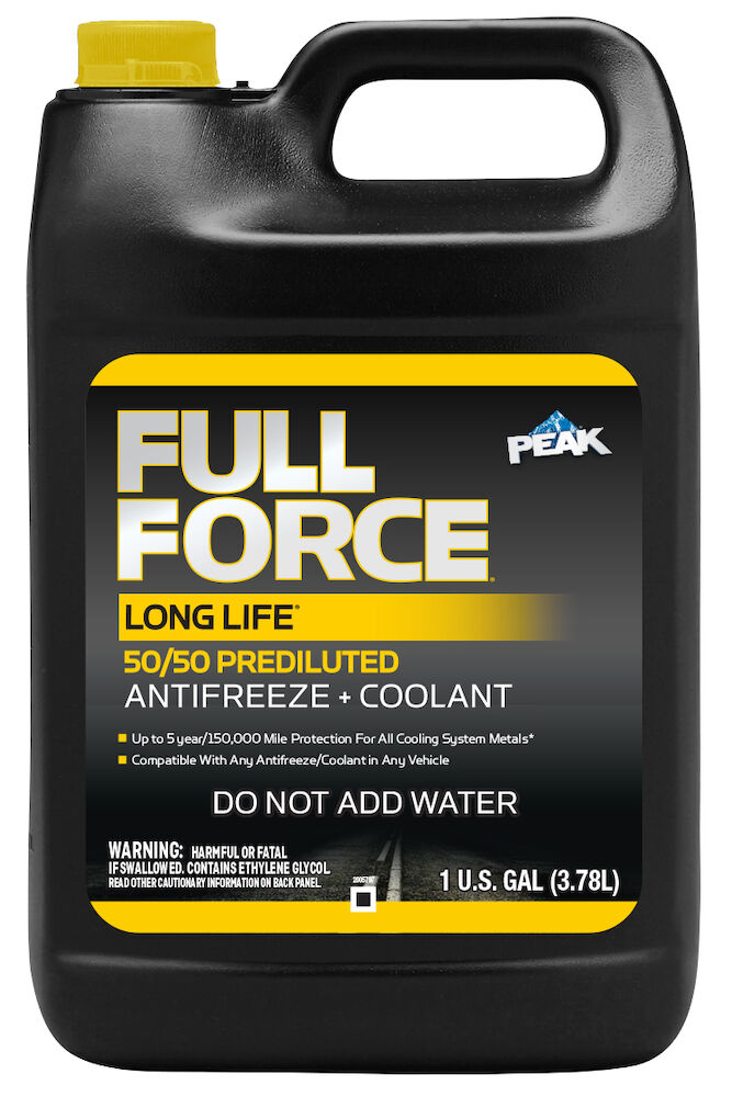 FULL FORCE® LONG LIFE® Antifreeze + Coolant features an extended life technology formulation which is recommended for use in all automobiles and light/medium-duty trucks. It is free of amines, phosphate, borate, nitrite, and silicate and can be mixed with any color antifreeze/coolant in any vehicle. Its inhibitors provide maximum protection against damaging rust and corrosion, while preventing freeze-up and boilover at extreme temperatures.