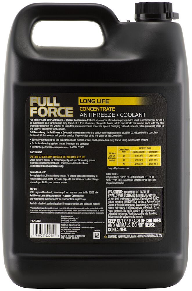 FULL FORCE® LONG LIFE® Antifreeze + Coolant is designed for use in all North American, Asian, and European passenger cars, SUVs, motorcycles, and light/medium-duty trucks, regardless of make, model, or year. Best performance is achieved when a complete flush & fill is performed using FULL FORCE® LONG LIFE® Antifreeze + Coolant Concentrate.