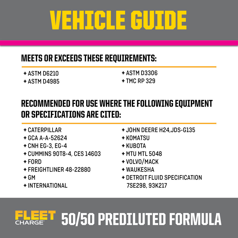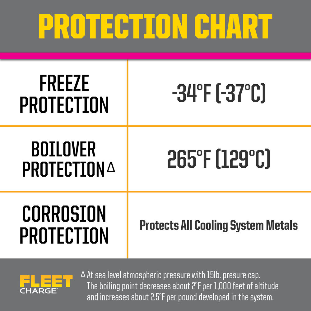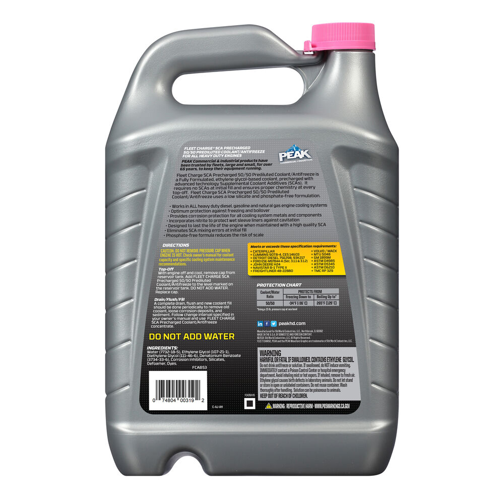 Adecuado para usar en TODOS los sistemas de enfriamiento de motores de servicio pesado a diésel, gasolina y gas natural. SCA precargado elimina la necesidad de SCA en el llenado inicial y en las recargas.