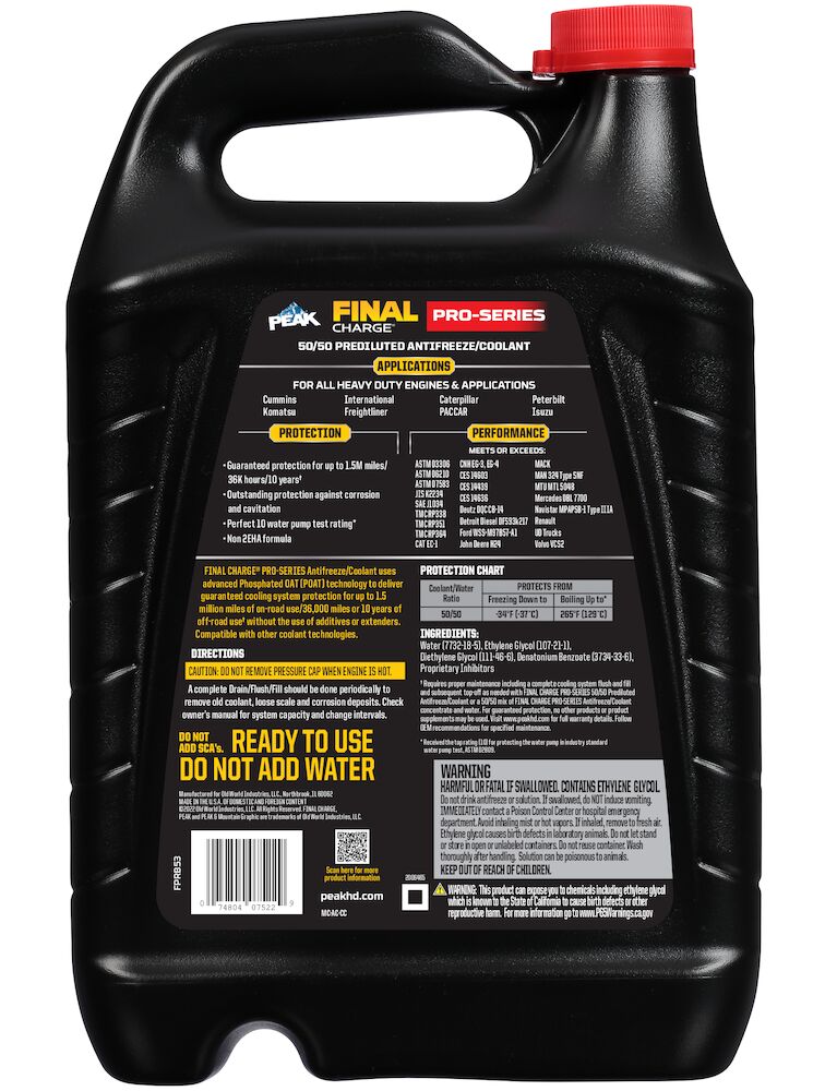 FINAL CHARGE® PRO-SERIES 50/50 Prediluted Antifreeze/Coolant is an advanced technology formula engineered to deliver the highest level of performance for today’s heavy duty engines. Its stabilized Phosphate enhanced Organic Acid Technology (POAT) corrosion inhibitor system provides fast-acting, long-lasting protection to all cooling system metals including Controlled Atmosphere Brazed (CAB) and cast aluminum components. Scale-fighting inhibitors help prevent deposit formation to maximize heat transfer. FINAL CHARGE® PRO-SERIES Antifreeze/Coolant is free of nitrite and 2-ethylhexanoic acid and is compatible with all system gaskets and hose materials. With proper maintenance†, FINAL CHARGE® PRO-SERIES Antifreeze/Coolant delivers guaranteed cooling system protection for 1.5 million miles, 10 years, or 36,000 hours, whichever comes first, without the use of Supplemental Coolant Additives (SCAs).