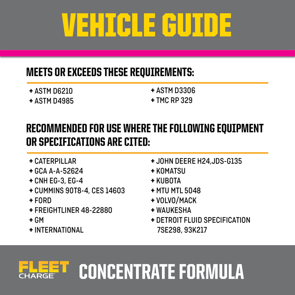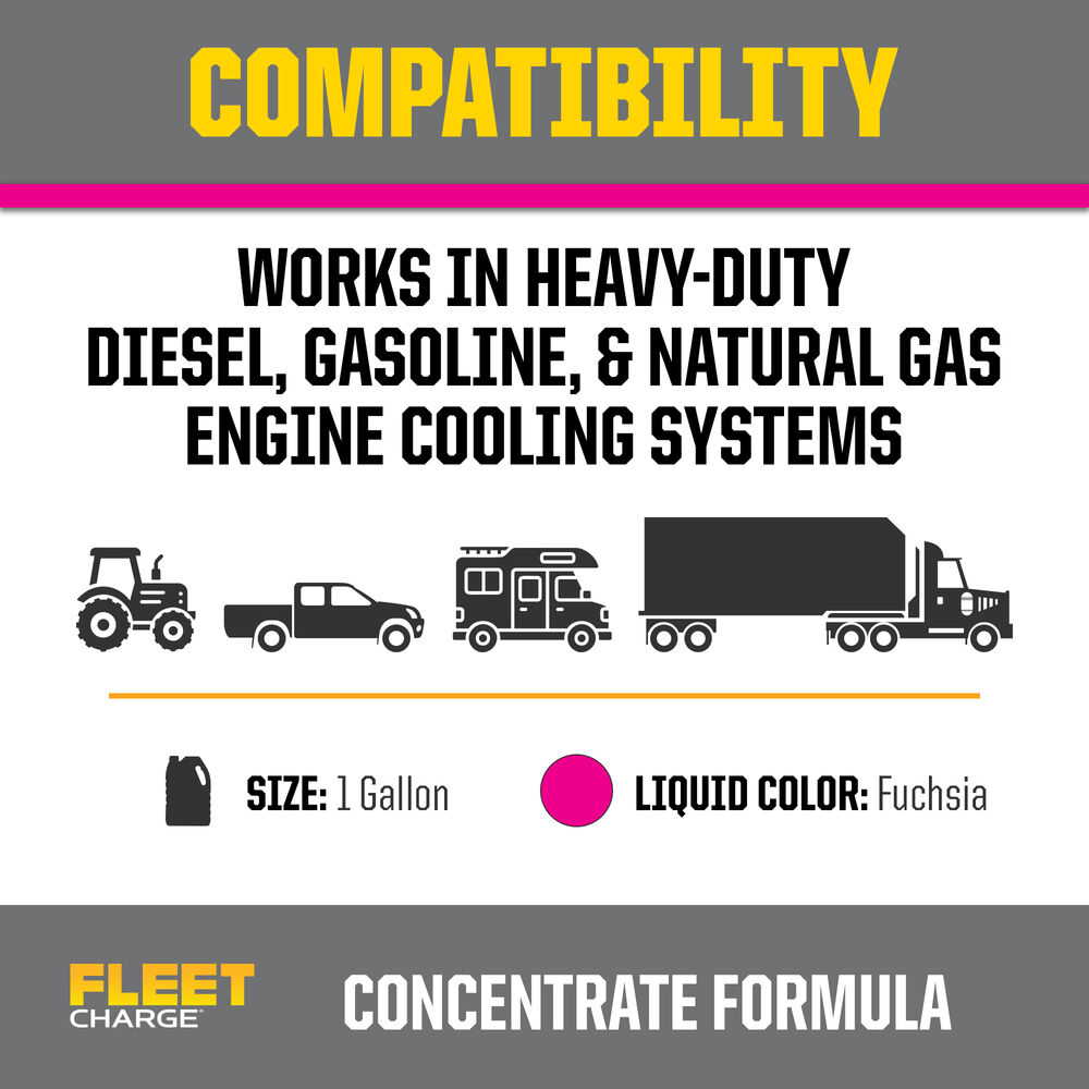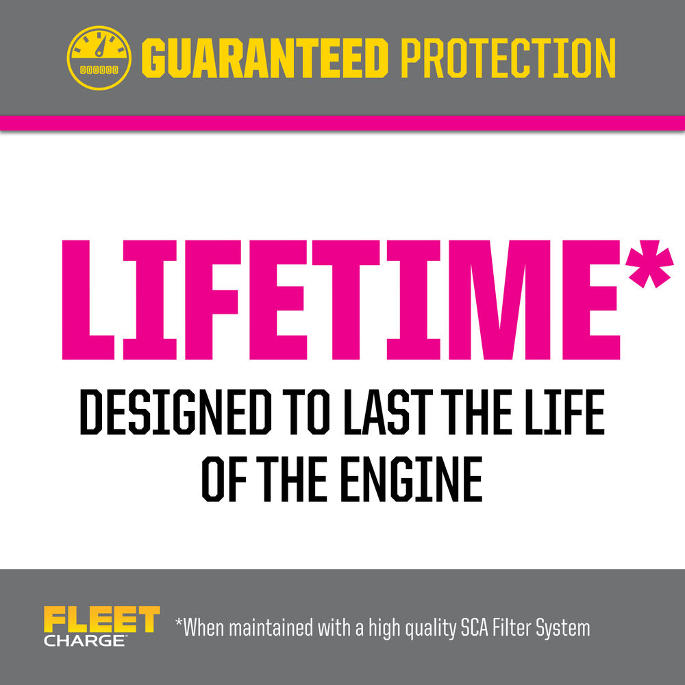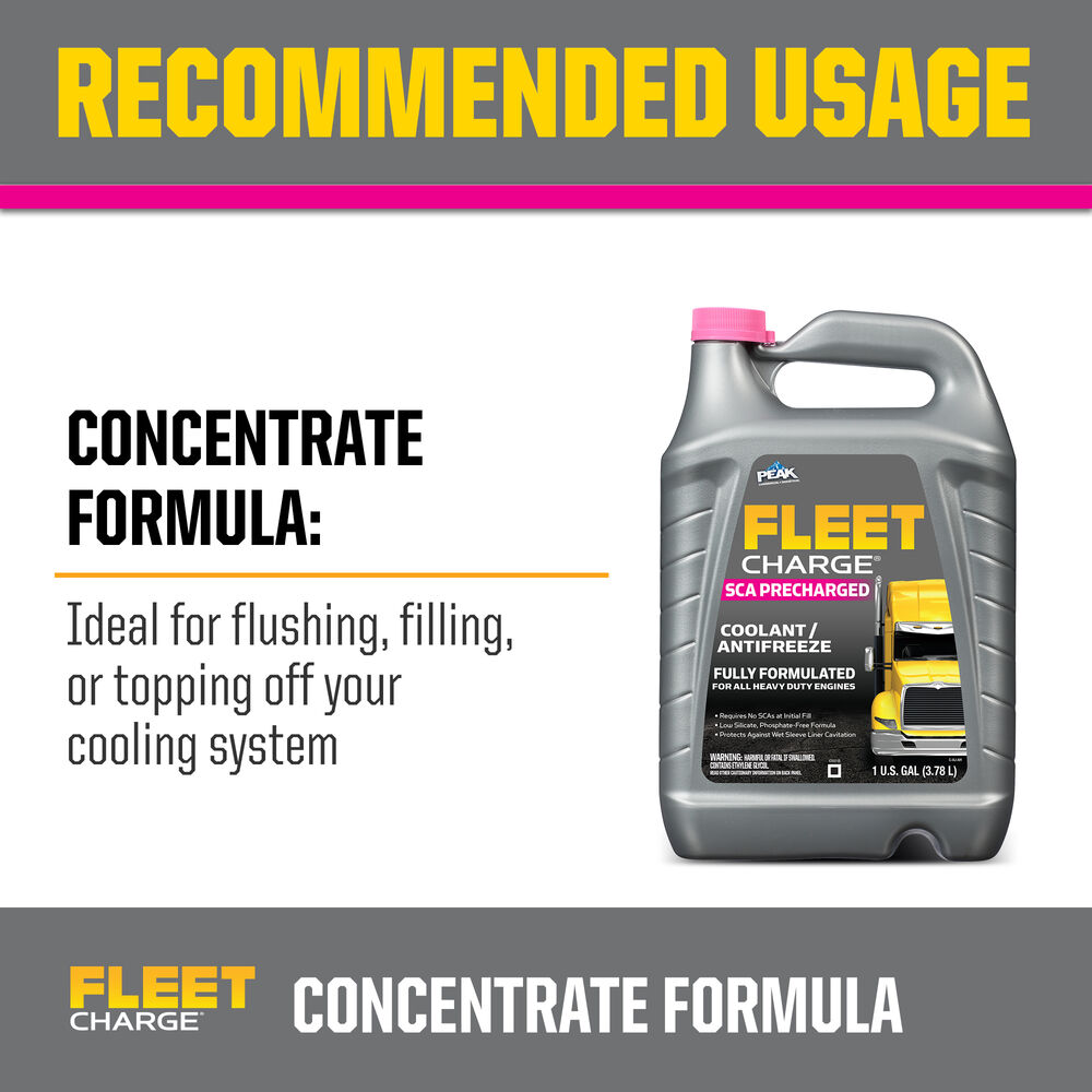 FLEET CHARGE® SCA Precharged Antifreeze + Coolant is a Fully Formulated, ethylene glycol-based coolant, precharged with advanced technology Supplemental Coolant Additives (SCAs). Because it is SCA precharged, FLEET CHARGE® SCA Precharged Antifreeze + Coolant requires no SCAs at initial fill and ensures proper chemistry at every top-off. FLEET CHARGE® SCA Precharged Antifreeze + Coolant uses a low silicate and phosphate-free formulation.