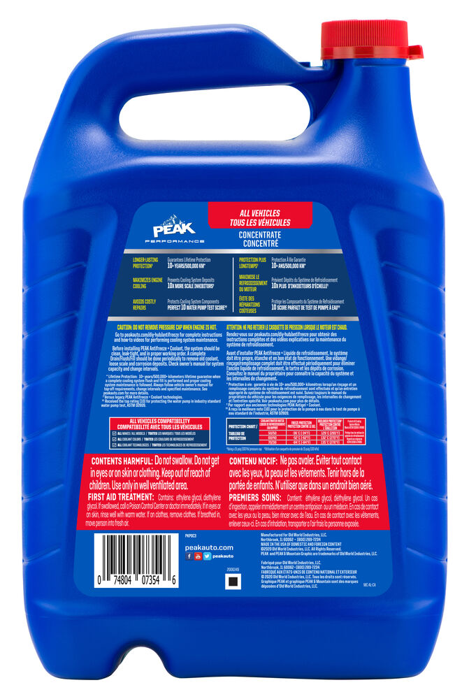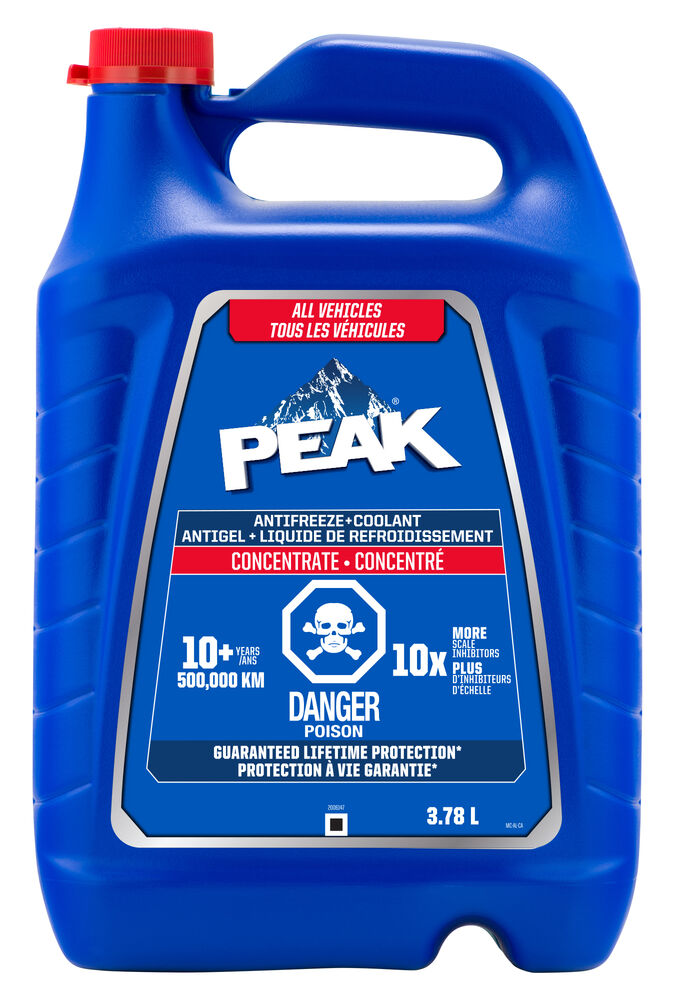 Where to BuyPEAK® Antifreeze + Coolant is specially engineered to deliver guaranteed lifetime protection*. It’s advanced all vehicle formula contains a proprietary blend of 10X more scale inhibitors† coupled with robust organic additives to fight against the damaging effects of scale deposits and corrosion. PEAK Antifreeze + Coolant is free of 2-EHA, silicate, nitrite, borate and amines, ensuring maximum cooling system performance for 10+ years/300,000+ miles*. It is compatible for use with any color or type of antifreeze/coolant in the system.