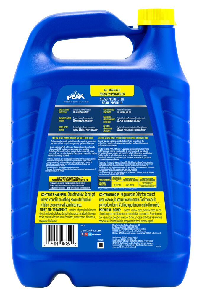 *Lifetime Protection: 10+ years/300,000+ miles lifetime guarantee when a complete cooling system flush and fill is performed and proper cooling system maintenance is followed. Always follow vehicle owner’s manual for top off requirements, change intervals and specified maintenance. See peakauto.com for more details.