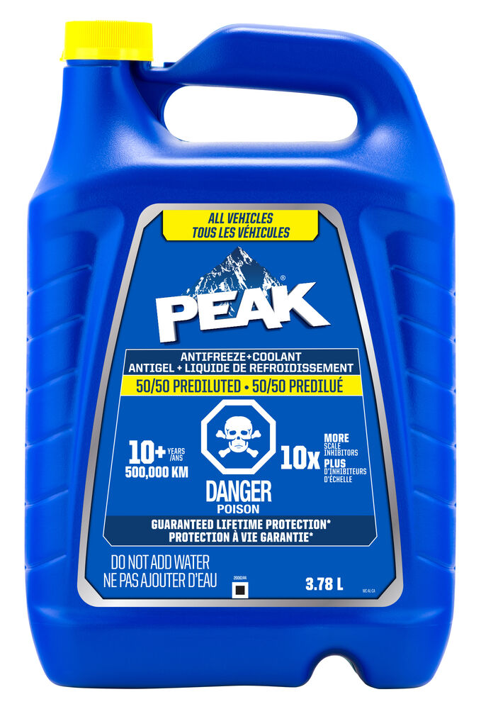 PEAK® Antifreeze + Coolant is specially engineered to deliver guaranteed lifetime protection*. It’s advanced all vehicle formula contains a proprietary blend of 10X more scale inhibitors† coupled with robust organic additives to fight against the damaging effects of scale deposits and corrosion. PEAK Antifreeze + Coolant is free of 2-EHA, silicate, nitrite, borate and amines, ensuring maximum cooling system performance for 10+ years/300,000+ miles*. It is compatible for use with any color or type of antifreeze/coolant in the system.