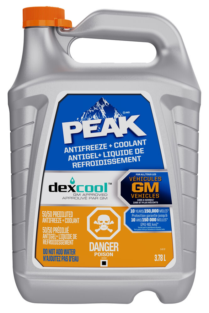 PEAK® DEX-COOL® Antifreeze + Coolant is a GM-approved ethylene glycol based premium coolant that can be used in all GM vehicles 1995 and newer. PEAK® DEX-COOL® Antifreeze + Coolant is a factory -approved technology that contains a well-balanced mix of Organic Acid Technology (OAT) and corrosion inhibitors for complete protection of modern, high-performance GM vehicle engines. It is compatible for use with other extended-life coolants and is free of silicate, borate, phosphate, nitrite, and amines. PEAK® DEX-COOL® Antifreeze + Coolant guarantees maximum cooling system performance for up to 10 years/150,000 miles*.