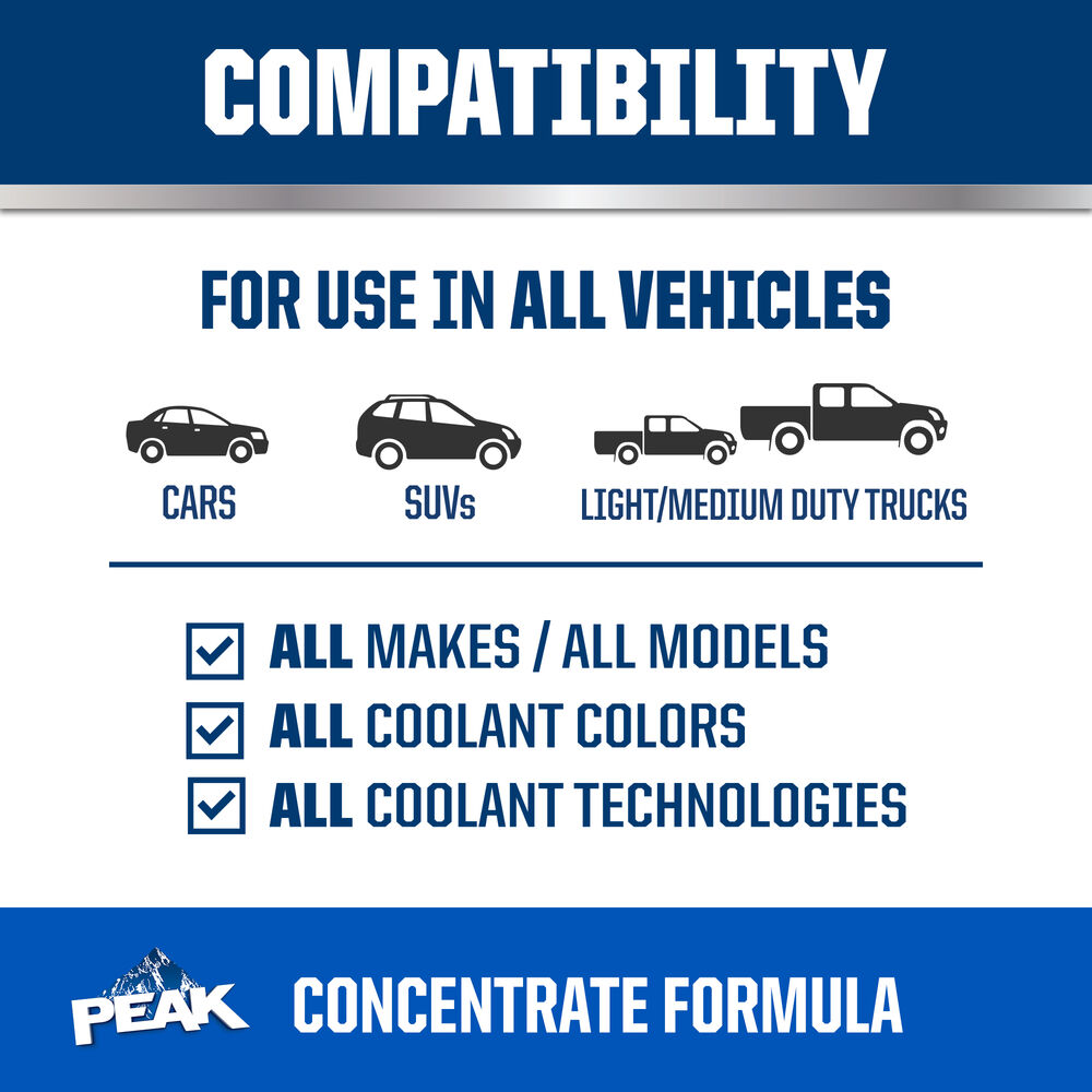 * 15+ years/500,000 miles guarantee when a complete cooling system flush and fill is performed and proper cooling system maintenance is followed. Always follow vehicle owner’s manual for top-off requirements, change intervals and specified maintenance. See PEAKGuarantee.com for more details or call 1-800-323-5440.