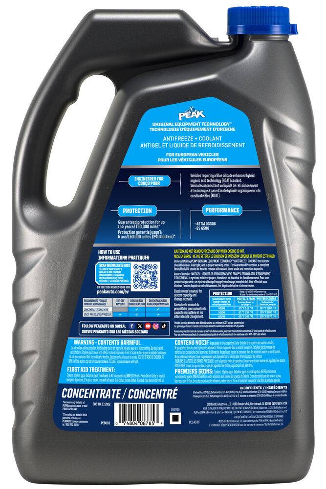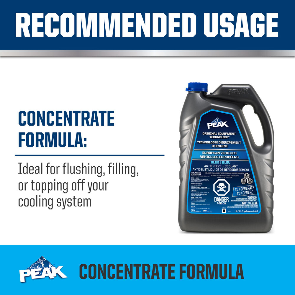 PEAK® ORIGINAL EQUIPMENT TECHNOLOGY™ ANTIFREEZE + COOLANT for EUROPEAN VEHICLES - BLUE is an ethylene glycol-based antifreeze/coolant specifically developed for use in any European vehicle requiring a blue silicate-enhanced hybrid organic acid technology (Si-HOAT) formula. It contains high-quality organic and inorganic corrosion inhibitors and is free of nitrite, phosphate and amines chemicals.