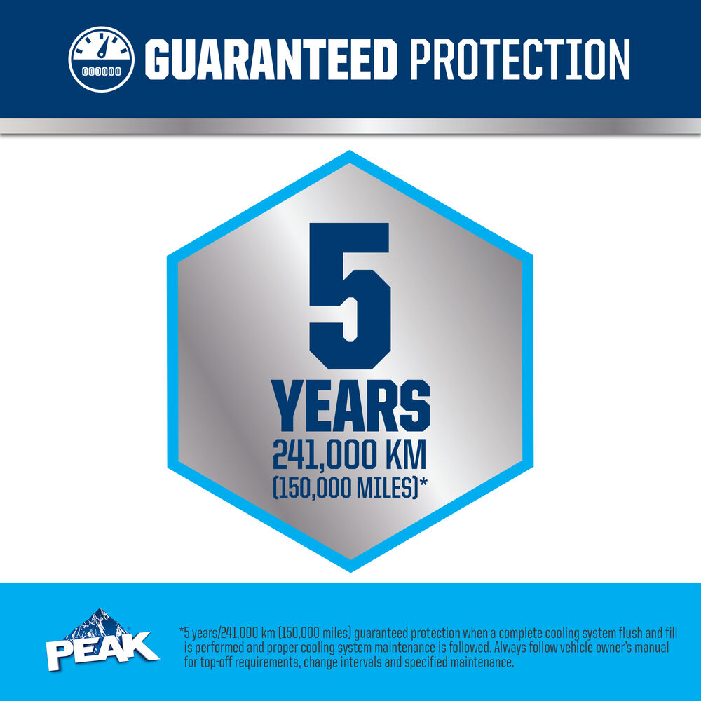 PEAK® ORIGINAL EQUIPMENT TECHNOLOGY™ ANTIFREEZE + COOLANT for EUROPEAN VEHICLES - BLUE meets the performance requirements of ASTM D3306 and BS 6580. With a complete flush and fill, PEAK guarantees this coolant will provide service life protection of up to 150,000 miles or 5 years*.