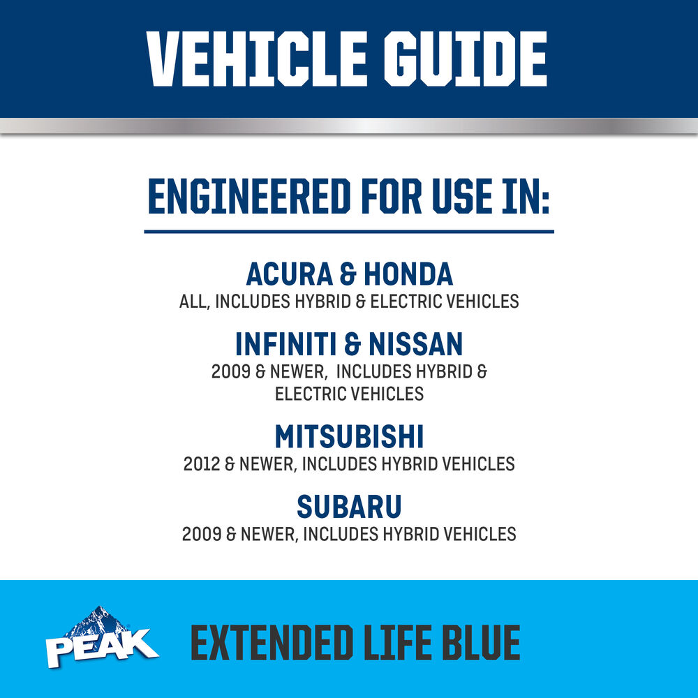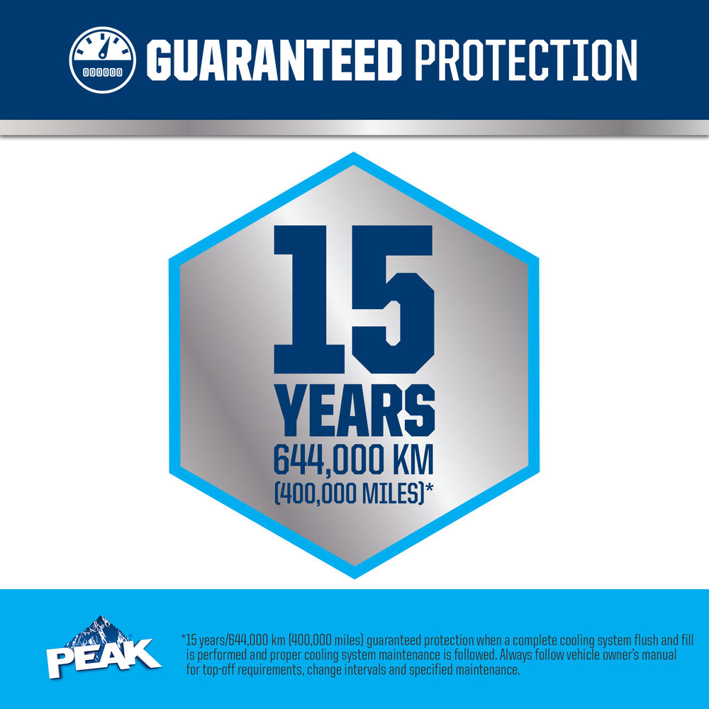 PEAK® ORIGINAL EQUIPMENT TECHNOLOGY™ ANTIFREEZE + COOLANT for ASIAN VEHICLES - BLUE meets the performance requirements of ASTM D3306 and JIS K2234. With a complete flush and fill, PEAK guarantees this coolant will provide service life protection of up to 400,000 miles or 15 years*.
