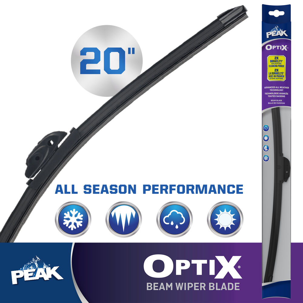 Where to BuyPEAK® OPTIX® beam wiper blades are uniquely engineered for 2X durability* with its heavy-duty aerodynamic spoiler design and long-lasting dual synthetic rubber. The beam blade technology evenly distributes pressure across the entire wiping element to hug the windshield for exceptional cleaning power. OPTIX beam wiper blades also feature advanced all weather technology combating extreme conditions for year round visibility. PEAK OPTIX beam wiper blades are equipped with EZ-SNAP® Universal Connector System which fits most wiper blade arms. Installation is quick and easy with simple to follow instructions inside packaging. Blades are available in lengths of 13" to 28".