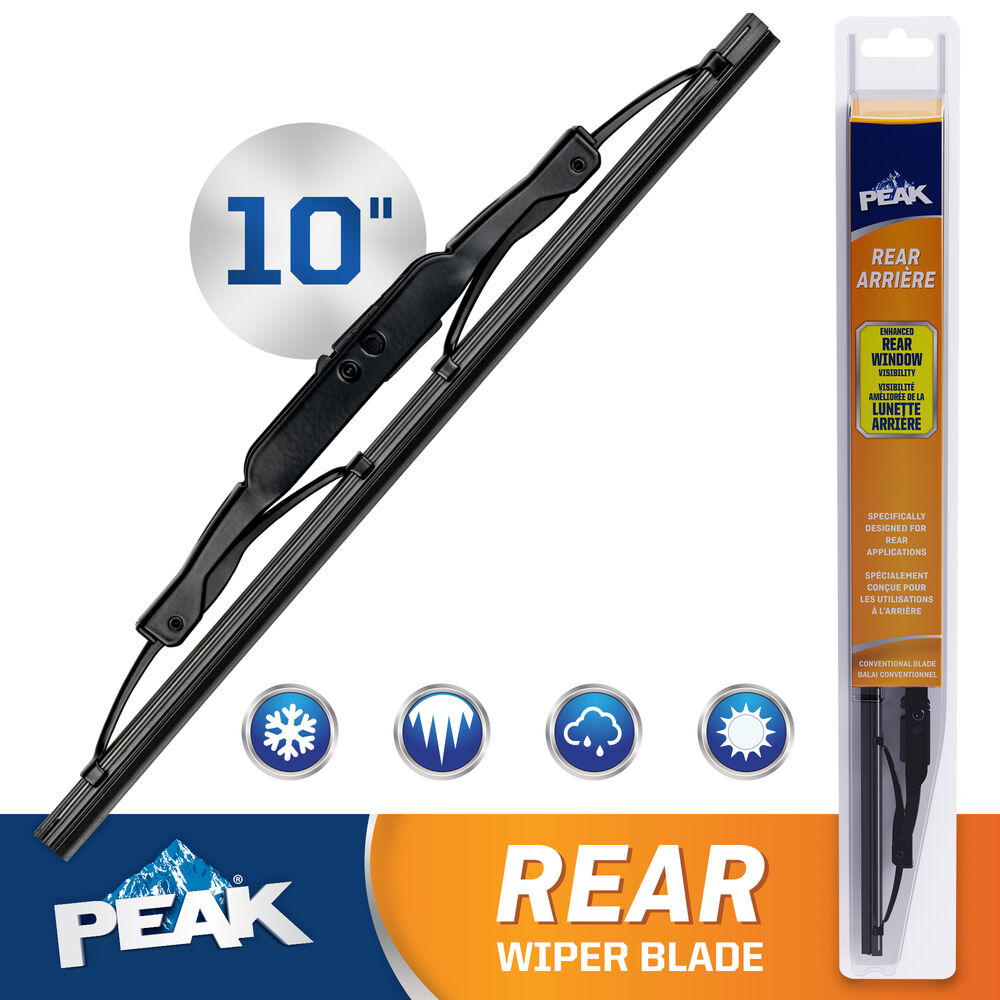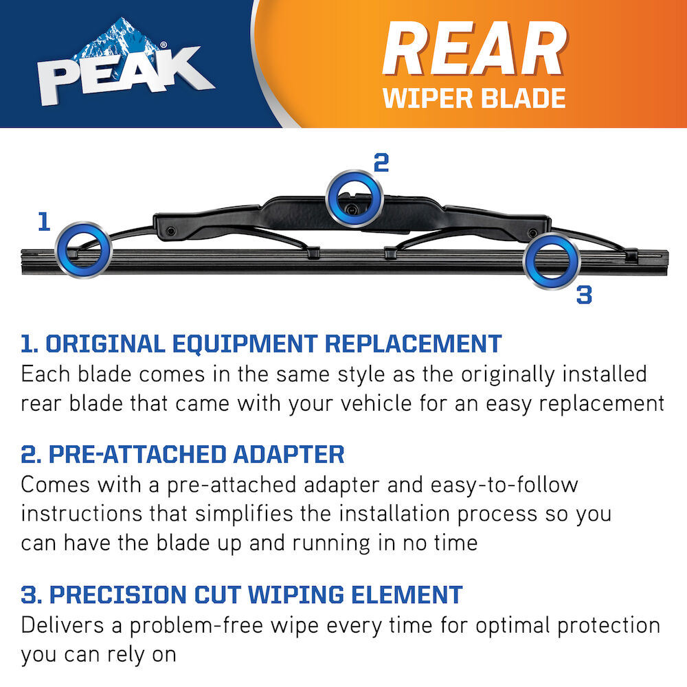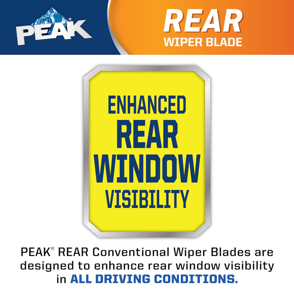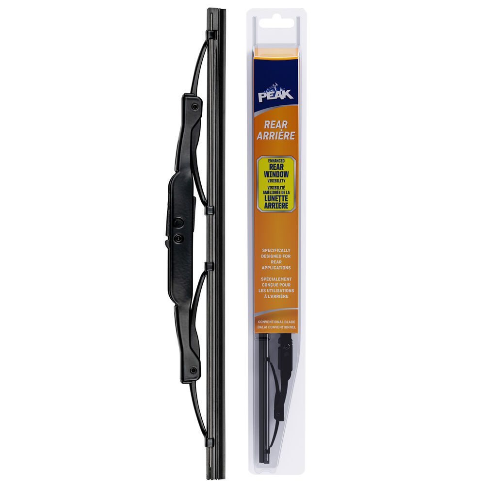 PEAK REAR wiper blades are designed to enhance rear window visibility in all driving conditions. These blades feature a precision cut wiping edge that delivers a problem-free wipe. PEAK offers a complete line of universal rear wiper blades to fit beam, integral and conventional wiper arms. Each blade is the same style as the originally installed rear blade that came with your vehicle. Installation is quick and easy with simple to follow instructions included in the package. Blades are available in lengths 10" to 16".