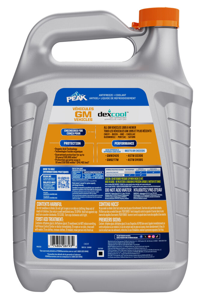 Où acheterL’antigel + liquide de refroidissement PEAKMD DEX-COOLMD est un liquide de refroidissement de qualité supérieure à base d’éthylène glycol approuvé par GM qui peut être utilisé dans tous les véhicules GM 1995 et plus récents. L’antigel + liquide de refroidissement PEAKMD DEX-COOLMD est une technologie approuvée en usine qui contient un mélange bien équilibré de technologie d’acide organique (Organic Acid Technology [OAT]) et d’inhibiteurs de corrosion pour une protection complète des moteurs de véhicules GM modernes et haute performance. Il est compatible avec d’autres liquides de refroidissement à durée de vie prolongée et est exempt de silicate, de borate, de phosphate, de nitrite et d’amines. L’antigel + liquide de refroidissement PEAKMD DEX-COOLMD garantit une performance maximale du système de refroidissement jusqu’à 10 ans/150 000 miles (241 401 km)*.