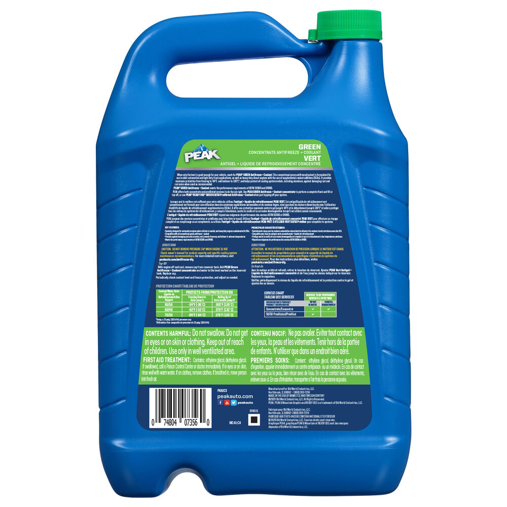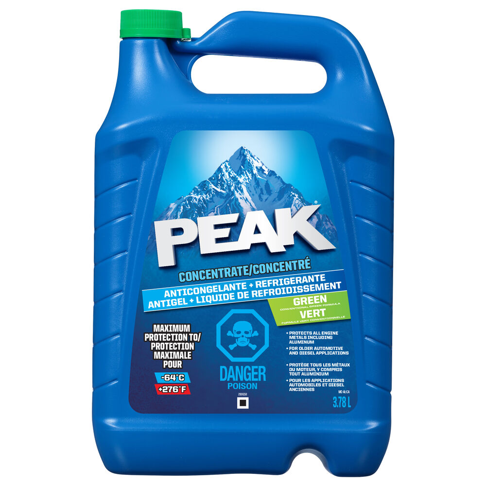 Où acheterL’antigel + liquide de refroidissement pleine puissance PEAK® est un antigel à base d’éthylène glycol conventionnel (vert) destiné à être utilisé dans les applications automobiles et d’essence/diesel légères. L’antigel + liquide de refroidissement à pleine puissance conventionnel PEAK offrent une protection maximale contre le gel jusqu’à -84 ˚F et l’ébullition jusqu’à +276 ˚F. Protège tous les systèmes de refroidissement, les métaux, y compris l’aluminium, contre les dommages causés par la rouille et la corrosion lorsqu’ils sont utilisés comme recommandé.