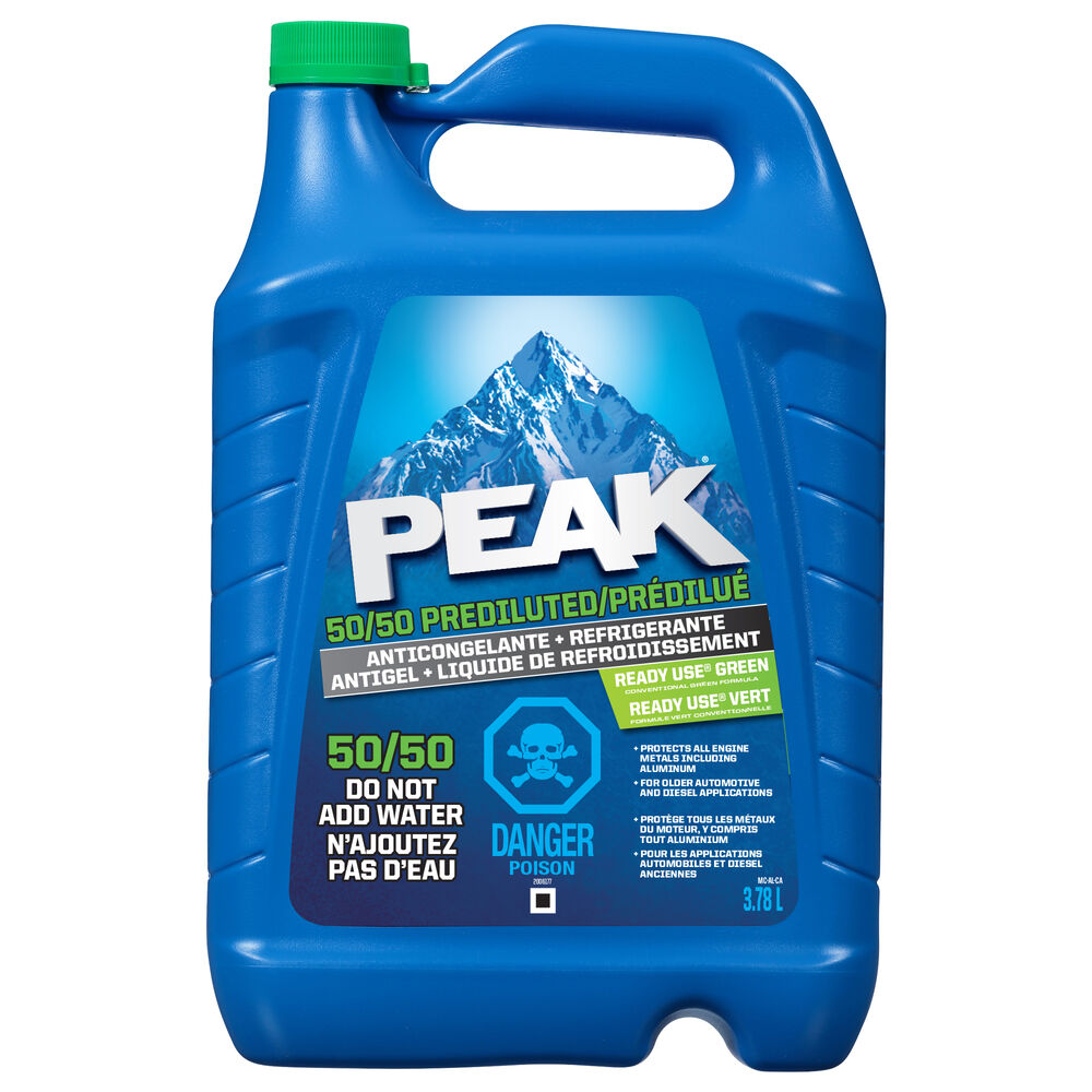L’antigel + liquide de refroidissement 50/50 PEAK® est un antigel à base d’éthylène glycol conventionnel (vert) destiné à être utilisé dans les applications automobiles et d’essence/diesel légères. L’antigel + liquide de refroidissement 50/50 conventionnel PEAK offrent une protection maximale contre le gel jusqu’à -84 ˚F et l’ébullition jusqu’à +276 ˚F. Protège tous les systèmes de refroidissement, les métaux, y compris l’aluminium, contre les dommages causés par la rouille et la corrosion lorsqu’ils sont utilisés comme recommandé.