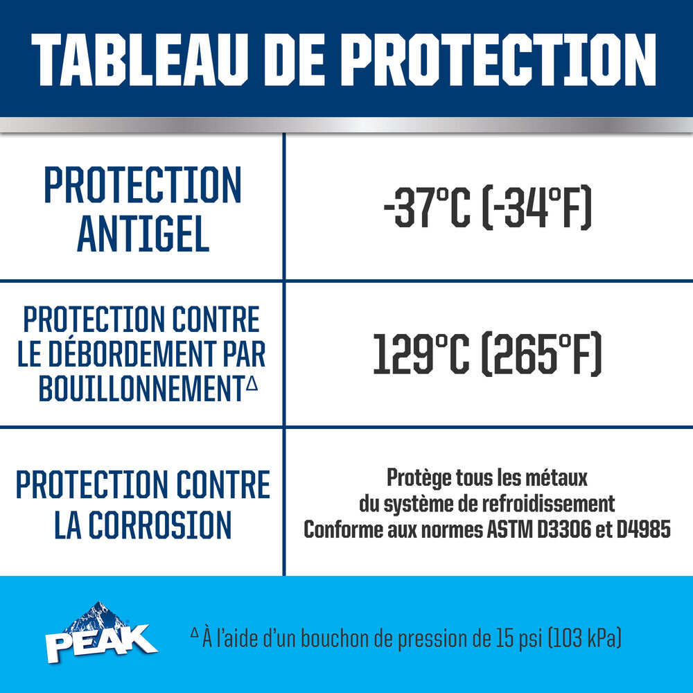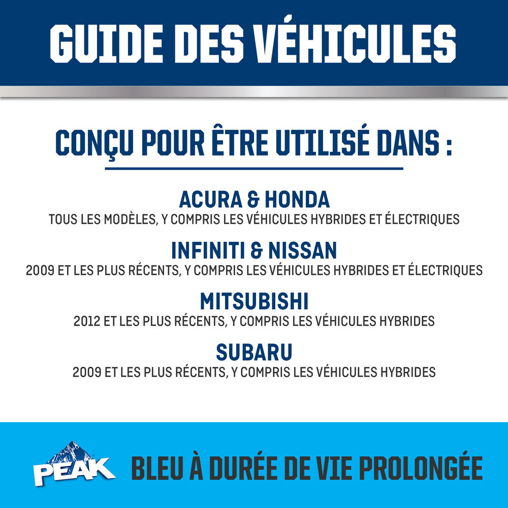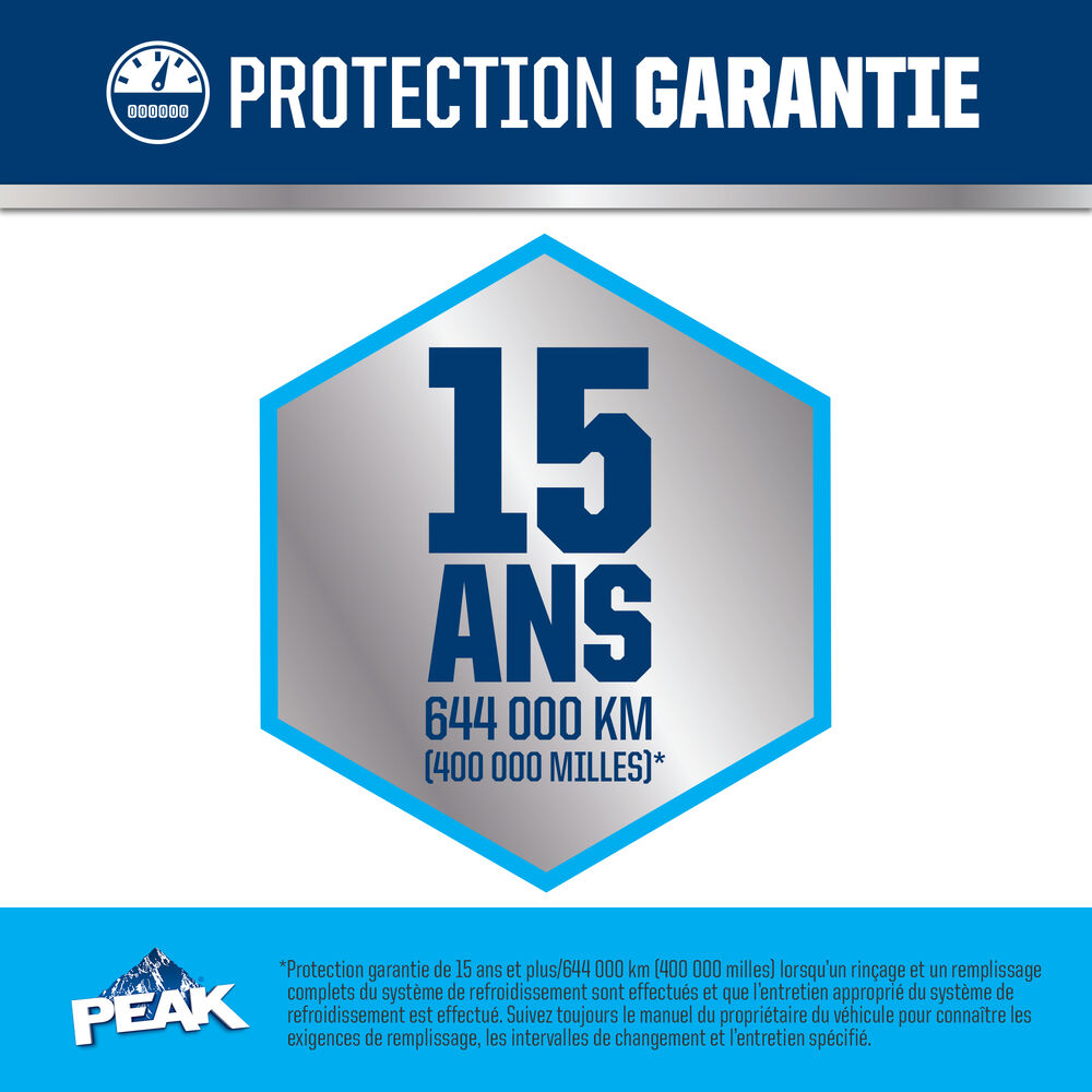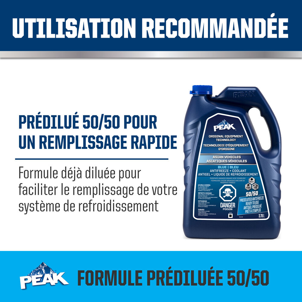 ANTIGEL + LIQUIDE DE REFROIDISSEMENT PEAK ORIGINAL EQUIPMENT TECHNOLOGY pour VÉHICULES ASIATIQUES – BLEU répond aux exigences des normes ASTM D3306 et JIS K2234 en matière de rendement. Avec un rinçage complet et un remplissage de liquide de refroidissement, PEAK garantit que ce liquide de refroidissement fournira une protection de durée de vie allant jusqu’à 400 000 milles ou 15 ans. Utilisez le produit L’ANTIGEL + LIQUIDE DE REFROIDISSEMENT PEAK ORIGINAL EQUIPMENT TECHNOLOGY 50/50 PRÉ-DILUÉ lorsque vous remplissez votre système.