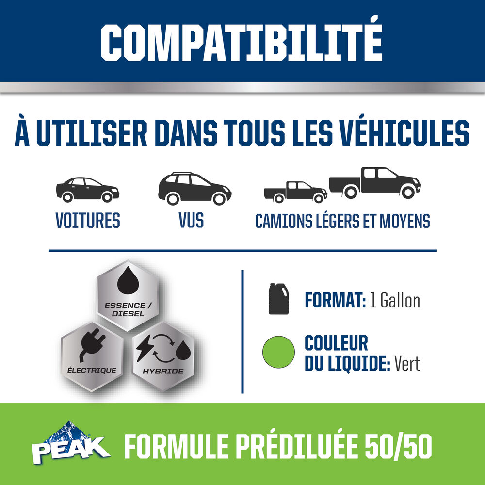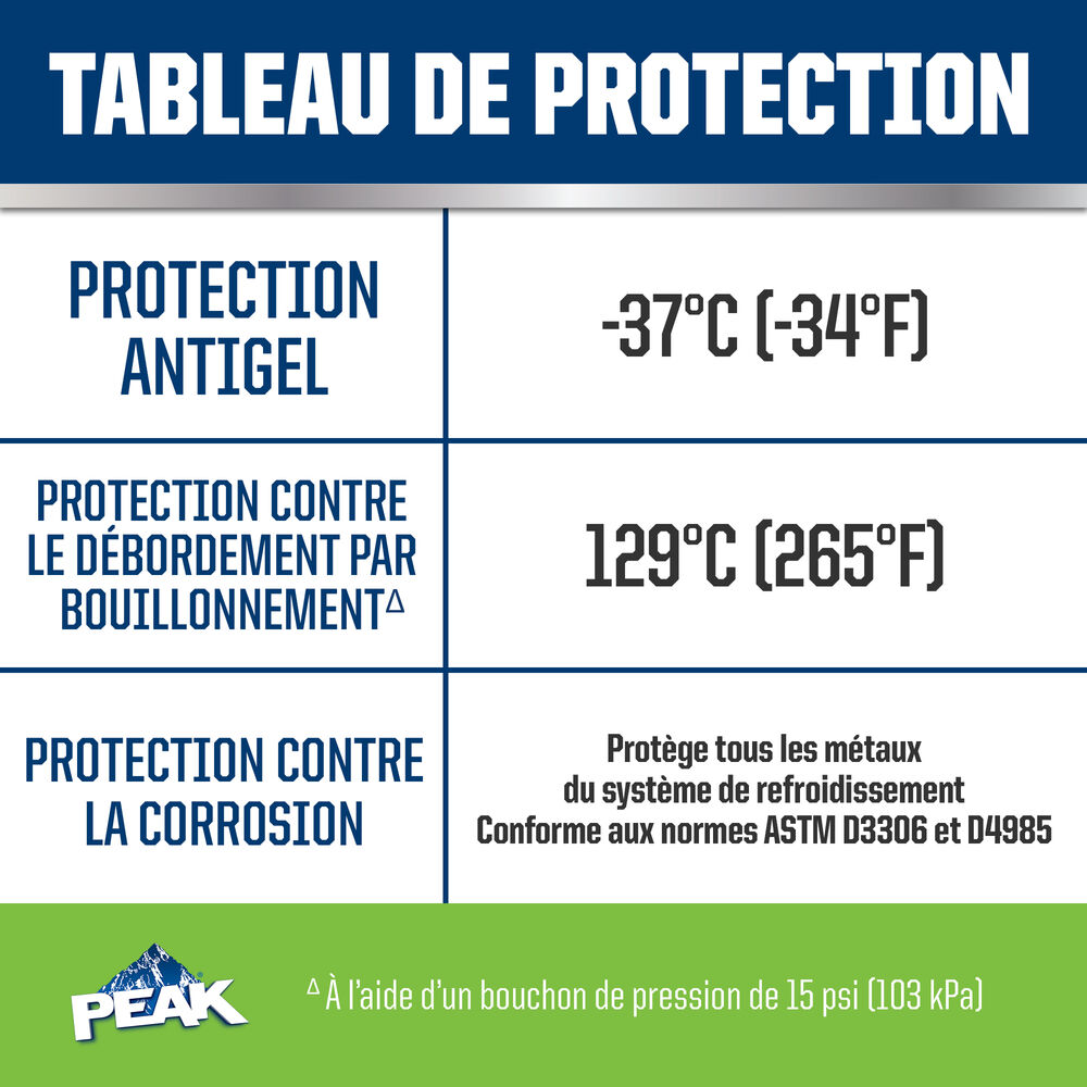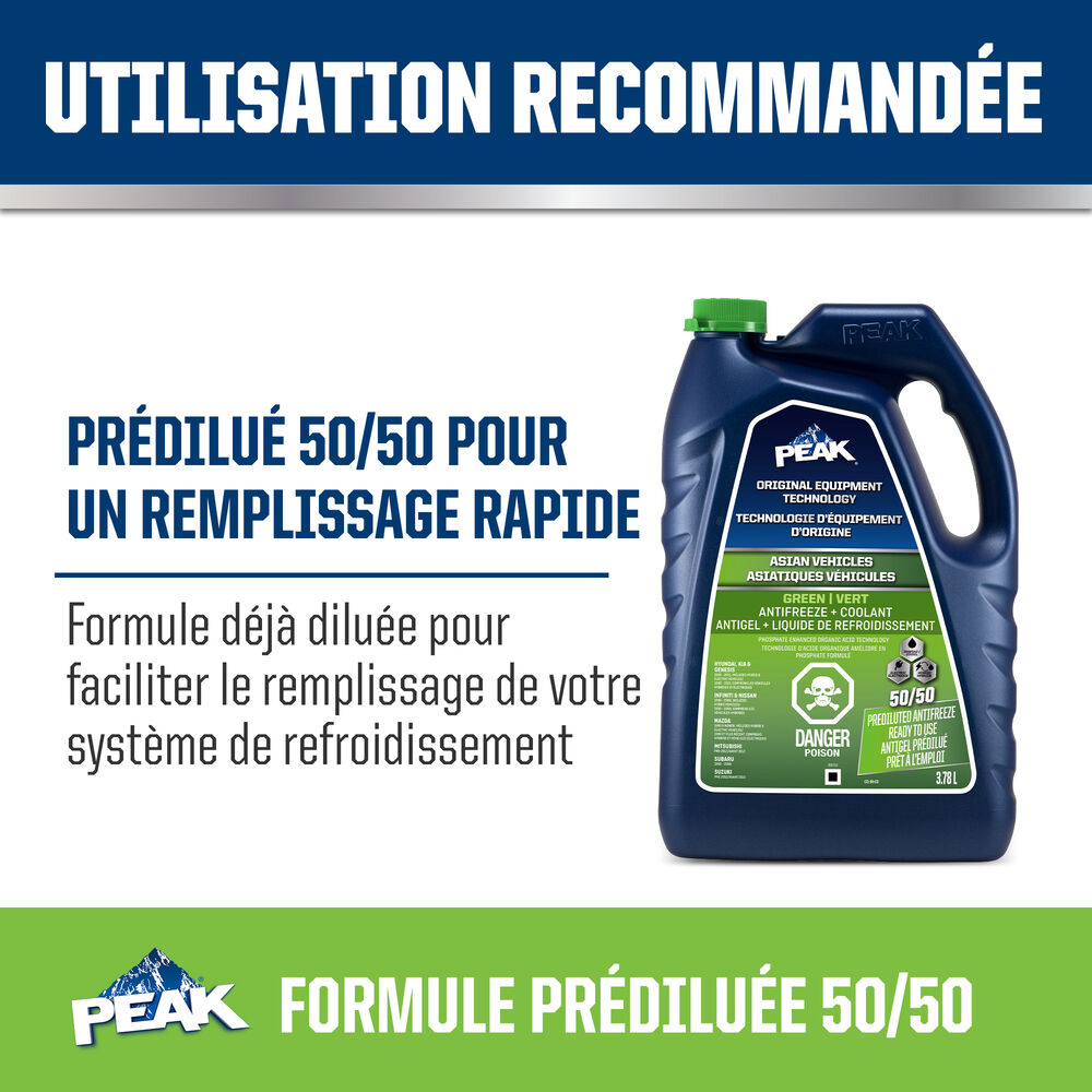 ANTIGEL + LIQUIDE DE REFROIDISSEMENT PEAK ORIGINAL EQUIPMENT TECHNOLOGY pour VÉHICULES ASIATIQUES – VERT répond aux exigences des normes ASTM D3306 et JIS K2234 en matière de rendement. Avec un rinçage complet et un remplissage de liquide de refroidissement, PEAK garantit que ce liquide de refroidissement fournira une protection de durée de vie allant jusqu’à 400 000 milles ou 15 ans. Utilisez le produit L’ANTIGEL + LIQUIDE DE REFROIDISSEMENT PEAK ORIGINAL EQUIPMENT TECHNOLOGY 50/50 PRÉ-DILUÉ lorsque vous remplissez votre système.
