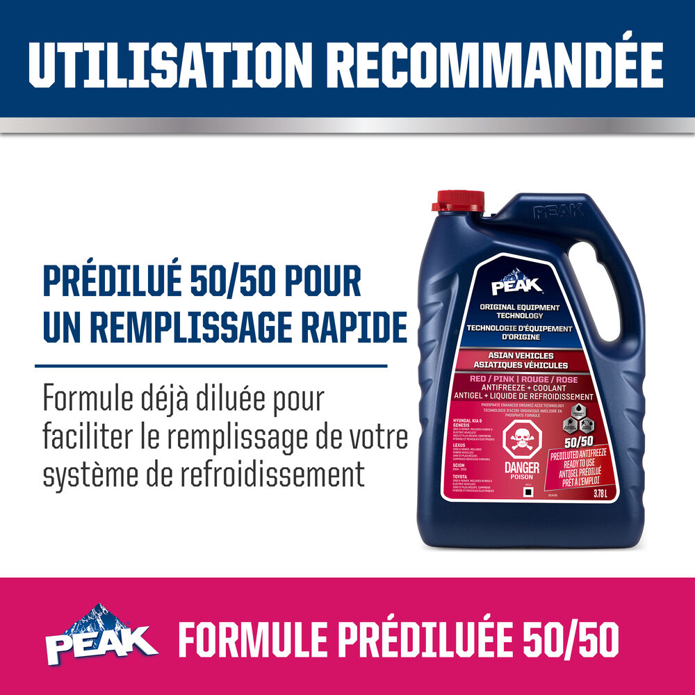 Antigel + liquide de refroidissement PEAK ORIGINAL EQUIPMENT TECHNOLOGY™ 50/50 pré-dilué pour véhicules asiatiques – ROUGE/ROSE