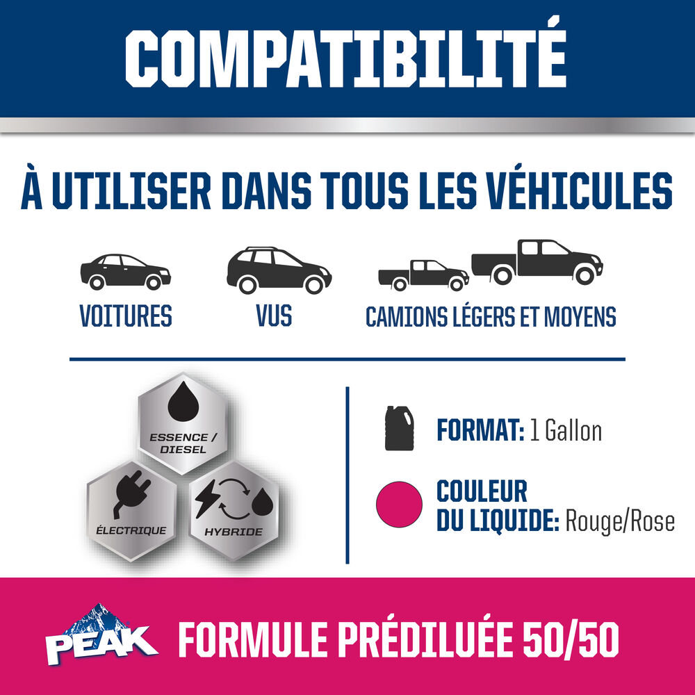 ANTIGEL + LIQUIDE DE REFROIDISSEMENT PEAK ORIGINAL EQUIPMENT TECHNOLOGY pour VÉHICULES ASIATIQUES – ROUGE/ROSE répond aux exigences des normes ASTM D3306 et JIS K2234 en matière de rendement. Avec un rinçage complet et un remplissage de liquide de refroidissement, PEAK garantit que ce liquide de refroidissement fournira une protection de durée de vie allant jusqu’à 400 000 milles ou 15 ans. Utilisez le produit L’ANTIGEL + LIQUIDE DE REFROIDISSEMENT PEAK ORIGINAL EQUIPMENT TECHNOLOGY 50/50 PRÉ-DILUÉ lorsque vous remplissez votre système.