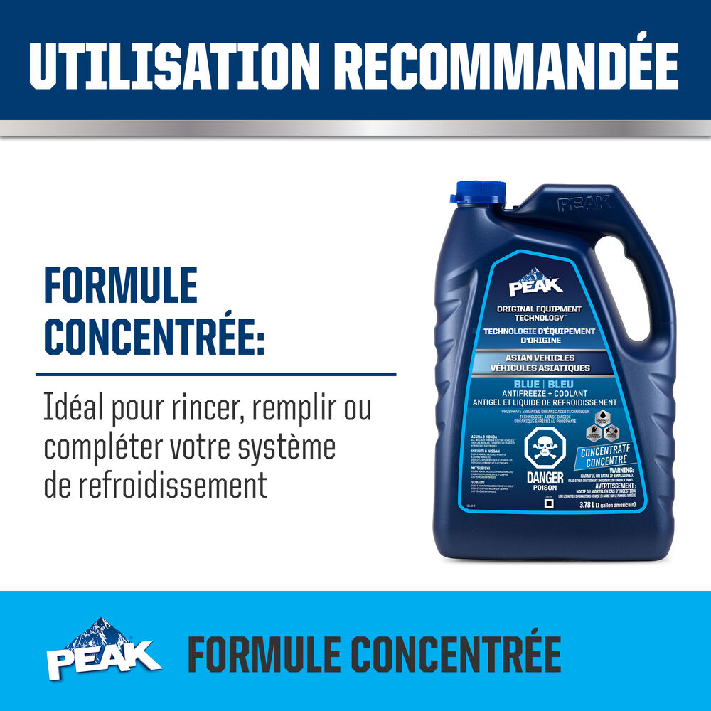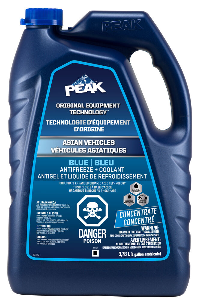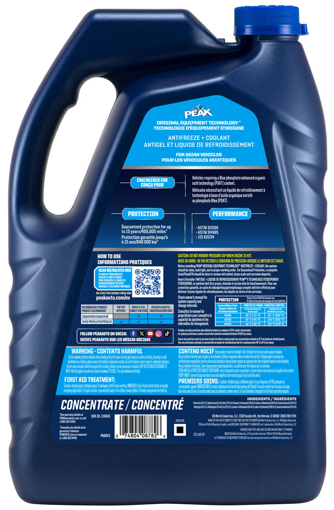 ANTIGEL + LIQUIDE DE REFROIDISSEMENT PEAK ORIGINAL EQUIPMENT TECHNOLOGY pour VÉHICULES ASIATIQUES – BLEU répond aux exigences des normes ASTM D3306 et JIS K2234 en matière de rendement. Avec un rinçage complet et un remplissage de liquide de refroidissement, PEAK garantit que ce liquide de refroidissement fournira une protection de durée de vie allant jusqu’à 400 000 milles ou 15 ans. Utilisez le produit L’ANTIGEL + LIQUIDE DE REFROIDISSEMENT PEAK ORIGINAL EQUIPMENT TECHNOLOGY 50/50 PRÉ-DILUÉ lorsque vous remplissez votre système.