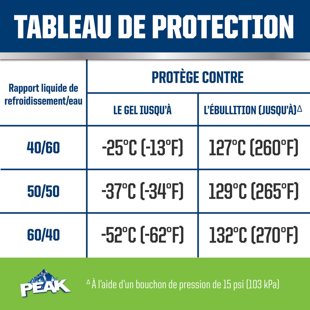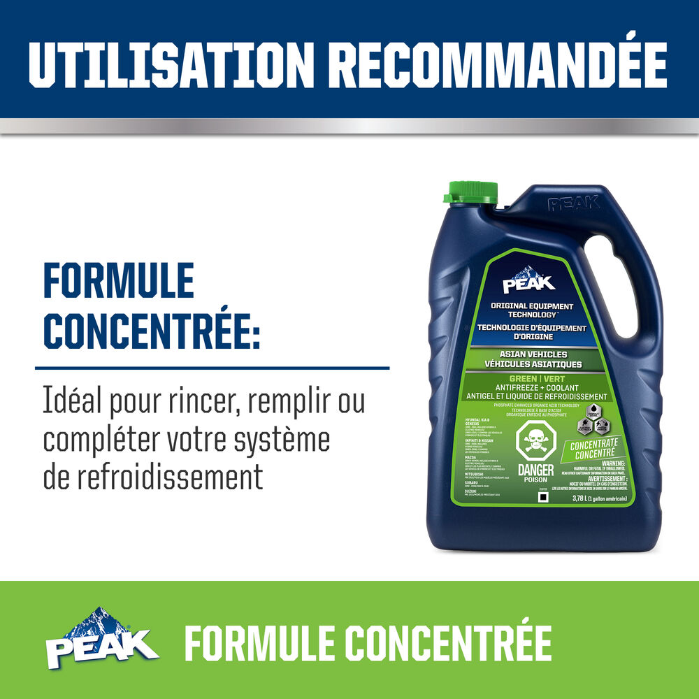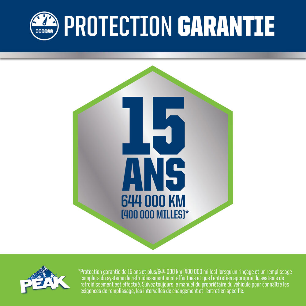 ANTIGEL + LIQUIDE DE REFROIDISSEMENT PEAK ORIGINAL EQUIPMENT TECHNOLOGY pour VÉHICULES ASIATIQUES – VERT répond aux exigences des normes ASTM D3306 et JIS K2234 en matière de rendement. Avec un rinçage complet et un remplissage de liquide de refroidissement, PEAK garantit que ce liquide de refroidissement fournira une protection de durée de vie allant jusqu’à 400 000 milles ou 15 ans. Utilisez le produit L’ANTIGEL + LIQUIDE DE REFROIDISSEMENT PEAK ORIGINAL EQUIPMENT TECHNOLOGY 50/50 PRÉ-DILUÉ lorsque vous remplissez votre système.