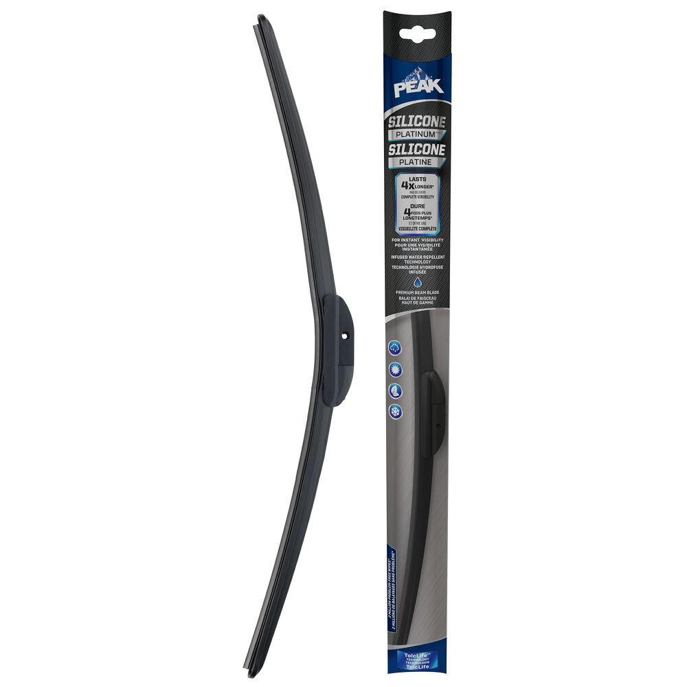 PEAKMD SILICONE PLATINE est notre balai d’essuie-glace haut de gamme, conçu pour durer quatre fois plus longtemps* et offrir une visibilité complète tout au long de chaque saison. La technologie de l’élément d’essuyage à quatre couches est construite avec un composé de silicone pour la longévité, offrant deux millions d’essuyages sans problème* pendant la durée de vie du balai. La technologie hydrofuge infusée recouvre le pare-brise, rejetant la pluie et les éclaboussures routières en hiver. L’utilisation de la technologie TalcLifeMD, un revêtement exclusif à base de talc, garantit un essuyage le plus lisse possible. Passez à un balai d’essuie-glace haut de gamme qui résiste à toutes les saisons avec les balais d’essuie-glace PEAKMD SILICONE PLATINE. Ces balais sont équipés du système de connexion universel pour s’adapter à la plupart des types de bras d’essuie-glace. L’installation est rapide et facile avec des instructions simples à suivre à l’intérieur de l’emballage. Les balais sont disponibles en longueurs de 13 po à 28 po.