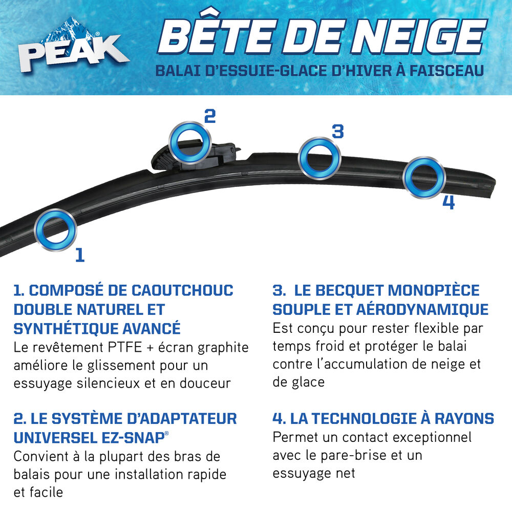 • ÉLÉMENT DE BALAYAGE EN CAOUTCHOUC SYNTHÉTIQUE NATUREL MASSIF 80 % plus grand* pour chasser la glace et la neige formulé pour être performant par temps extrême *Comparativement aux balais d’essuie-glace conventionnels de marque PEAK.