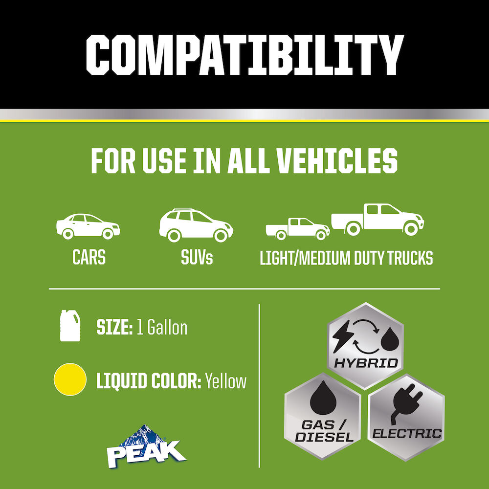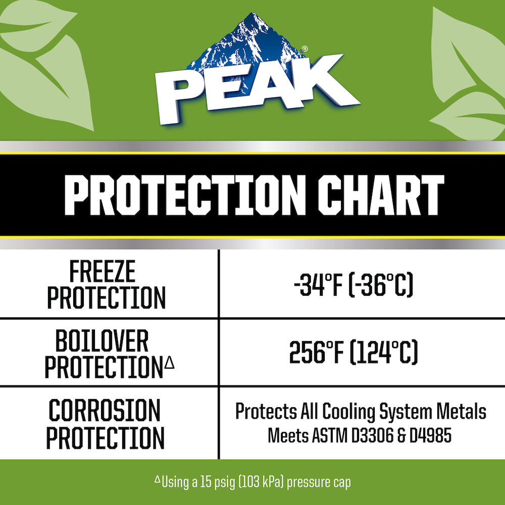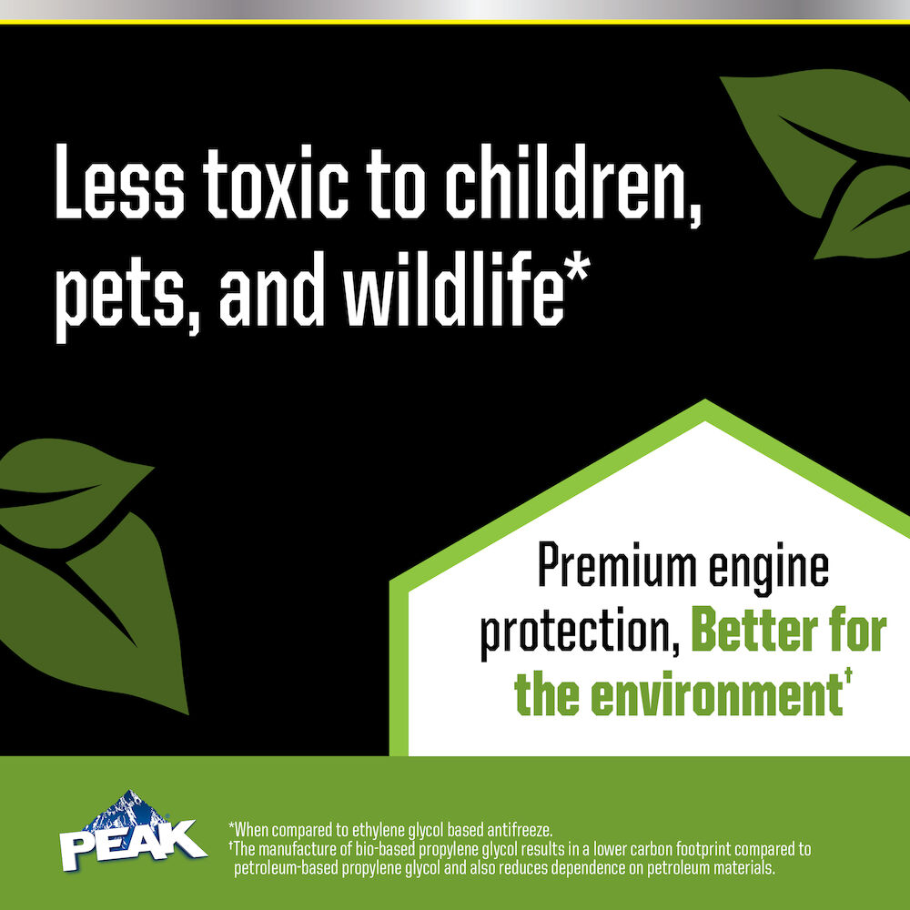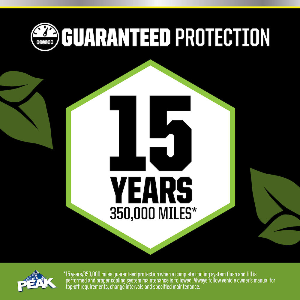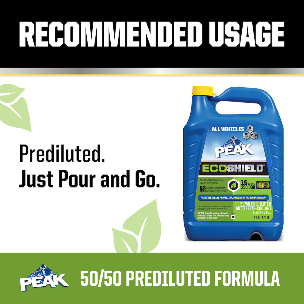 PEAK® ECOSHIELD™ 50/50 Prediluted Antifreeze/Coolant offers premium engine protection for 15 years and 350,000 miles† and is better for the environment.* The manufacture of bio-based propylene glycol results in a lower carbon footprint compared to petroleum-based propylene glycol and also reduces dependence on petroleum materials. PEAK® ECOSHIELD™ 50/50 Prediluted is for use in all vehicles and is compatible with all makes and models, all coolant colors, and all coolant technologies.