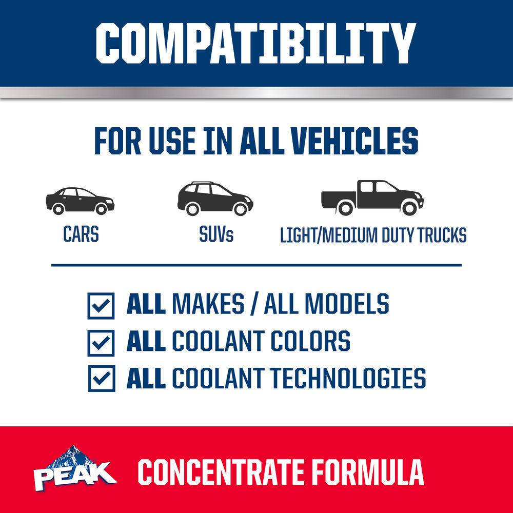 • PEAK® Universal Antifreeze + Coolant is designed for use in all North American, Asian and European passenger cars, SUVs, motorcycles and light/medium duty trucks, regardless of make, model or year.