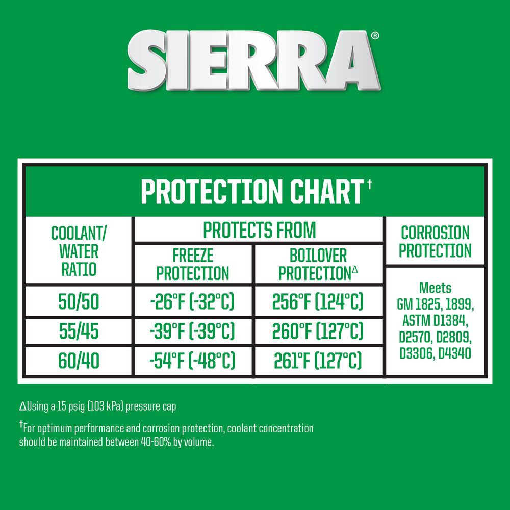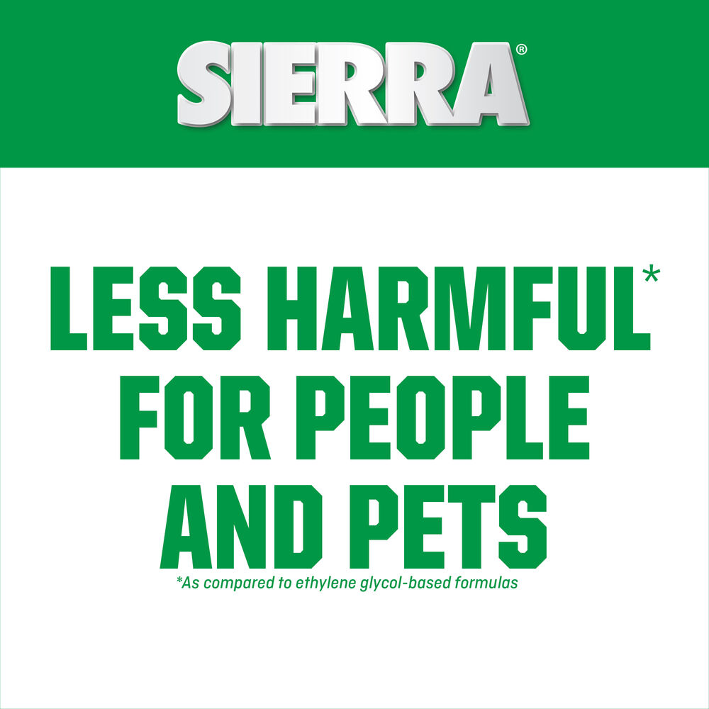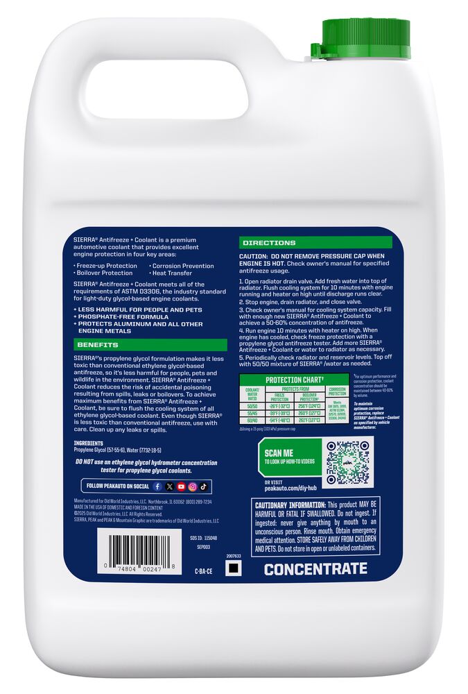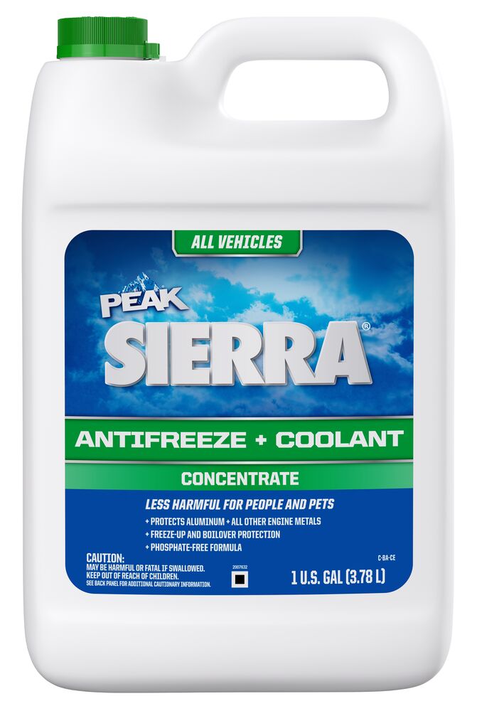 PEAK® is the pioneer and market leader in the safer propylene glycol (PG) antifreeze category. SIERRA® Antifreeze/Coolant is formulated with PG rather than ethylene glycol – the base for traditional antifreeze. Because of its PG formula, SIERRA® Antifreeze is less toxic and therefore safer for people, pets, and wildlife than conventional antifreeze. It is a premium automotive coolant that provides excellent freeze-up and boil-over protection and outstanding corrosion protection.