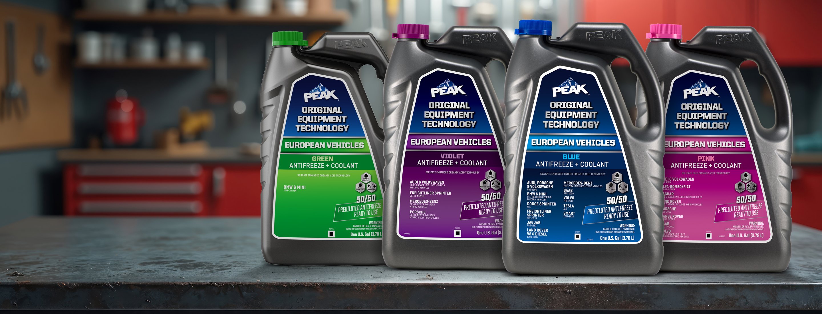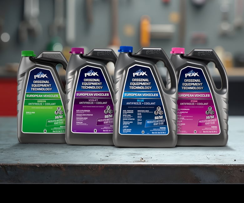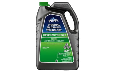 PEAK ORIGINAL EQUIPMENT TECHNOLOGY™ ANTIFREEZE + COOLANT for EUROPEAN VEHICLES is a line of premium coolants specifically designed to match the technology and color requirements of European vehicles. Each coolant is formulated with the same corrosion inhibitor technology that protected your vehicle straight from the factory. These formulas will provide excellent protection against rust and corrosion to all cooling system metals, including aluminum, and are fully compatible with other extended life coolants. Color cues on the packaging and a list of covered vehicles on the front label make it easy to identify the right match for your specific vehicle.