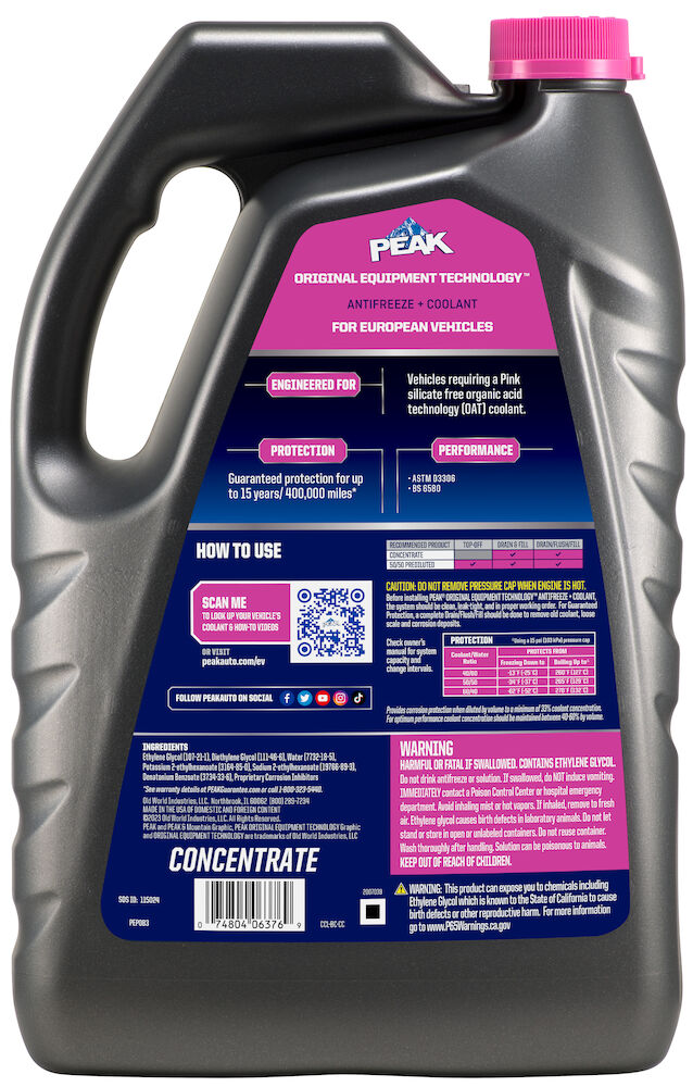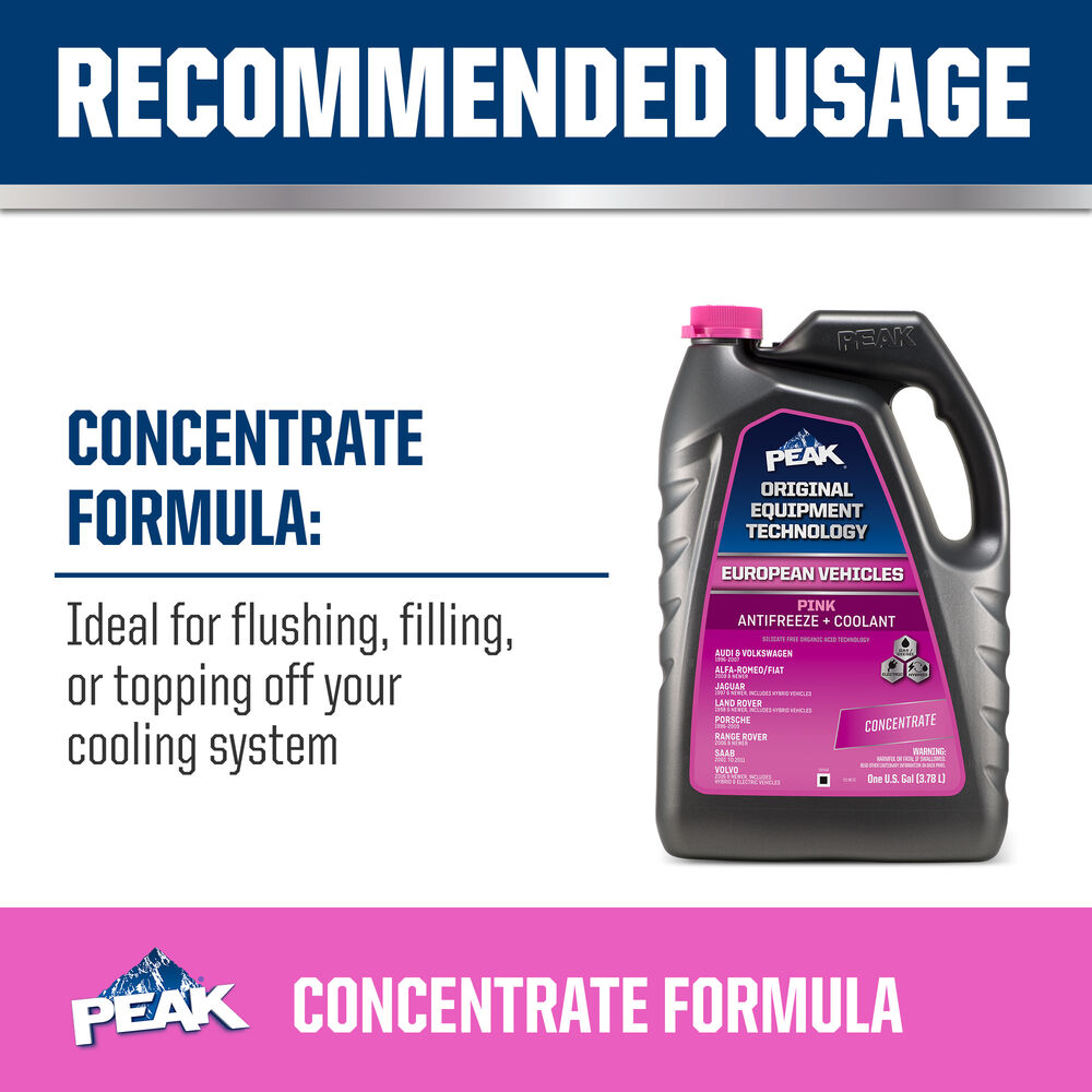 PEAK® ORIGINAL EQUIPMENT TECHNOLOGY™ ANTIFREEZE + COOLANT for EUROPEAN VEHICLES - PINK is an ethylene glycol-based antifreeze/coolant specifically developed for use in any European vehicle requiring a pink silicate-free organic acid technology (OAT) formulation. It contains high-quality organic acid corrosion inhibitors and is free of borate, nitrite, nitrate, phosphate, silicate and amines.