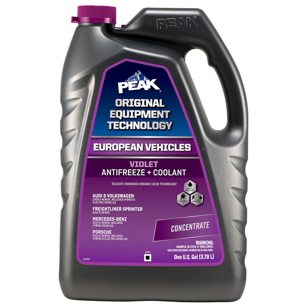 PEAK® ORIGINAL EQUIPMENT TECHNOLOGY™ ANTIFREEZE + COOLANT for EUROPEAN VEHICLES - VIOLET is an ethylene glycol-based antifreeze/coolant specifically developed for use in any European vehicle requiring a violet silicate-enhanced organic acid technology (Si-OAT) formula. It contains high-quality organic acid corrosion inhibitors and is free of borate, nitrite, nitrate, phosphate and amines.