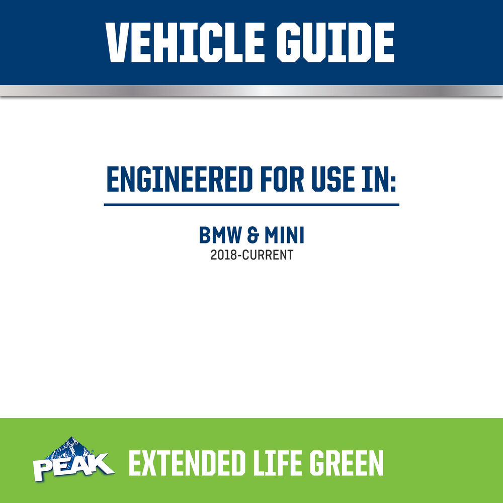 PEAK® ORIGINAL EQUIPMENT TECHNOLOGY™ ANTIFREEZE + COOLANT for EUROPEAN VEHICLES - GREEN meets the performance requirements of ASTM D3306 and BS 6580. With a complete flush and fill, PEAK guarantees this coolant will provide service life protection of up to 150,000 miles or 5 years*.