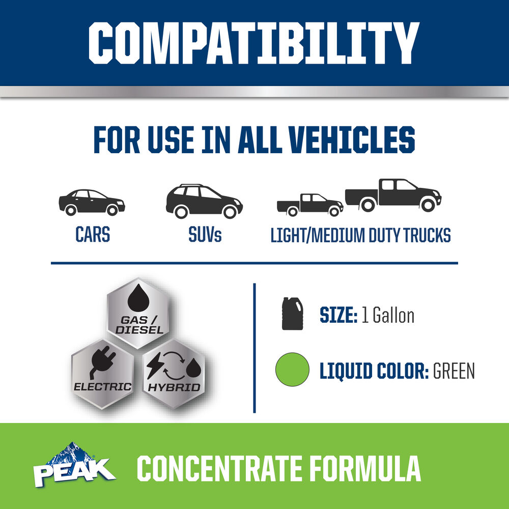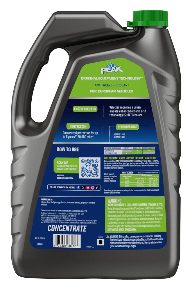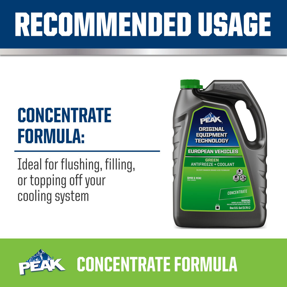 PEAK® ORIGINAL EQUIPMENT TECHNOLOGY™ ANTIFREEZE + COOLANT for EUROPEAN VEHICLES - GREEN is an ethylene glycol-based antifreeze/coolant specifically developed for use in any European vehicle requiring a blue silicate-enhanced hybrid organic acid technology (Si-HOAT) formula. It contains high-quality organic and inorganic corrosion inhibitors and is free of nitrite, phosphate and amines chemicals.