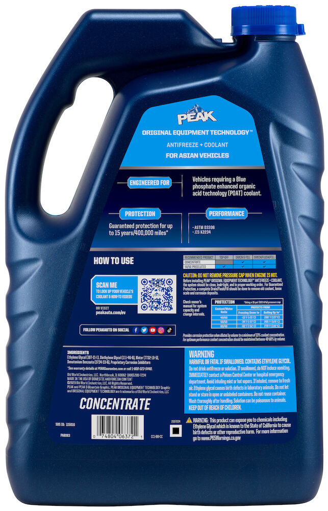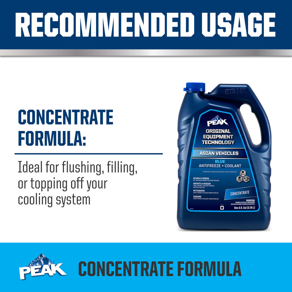 PEAK® ORIGINAL EQUIPMENT TECHNOLOGY™ ANTIFREEZE + COOLANT for ASIAN VEHICLES - BLUE is an ethylene glycol-based antifreeze/coolant specifically developed for use in any Asian vehicle requiring a Blue phosphate-enhanced organic acid technology (POAT) formulation. It contains high-quality organic acid corrosion inhibitors and is free of borate, nitrite, silicate and amines.
