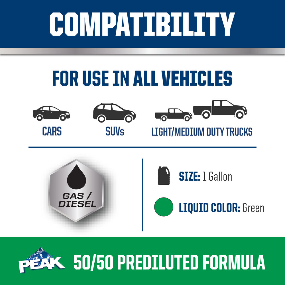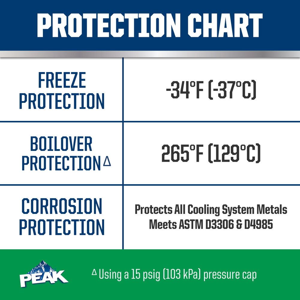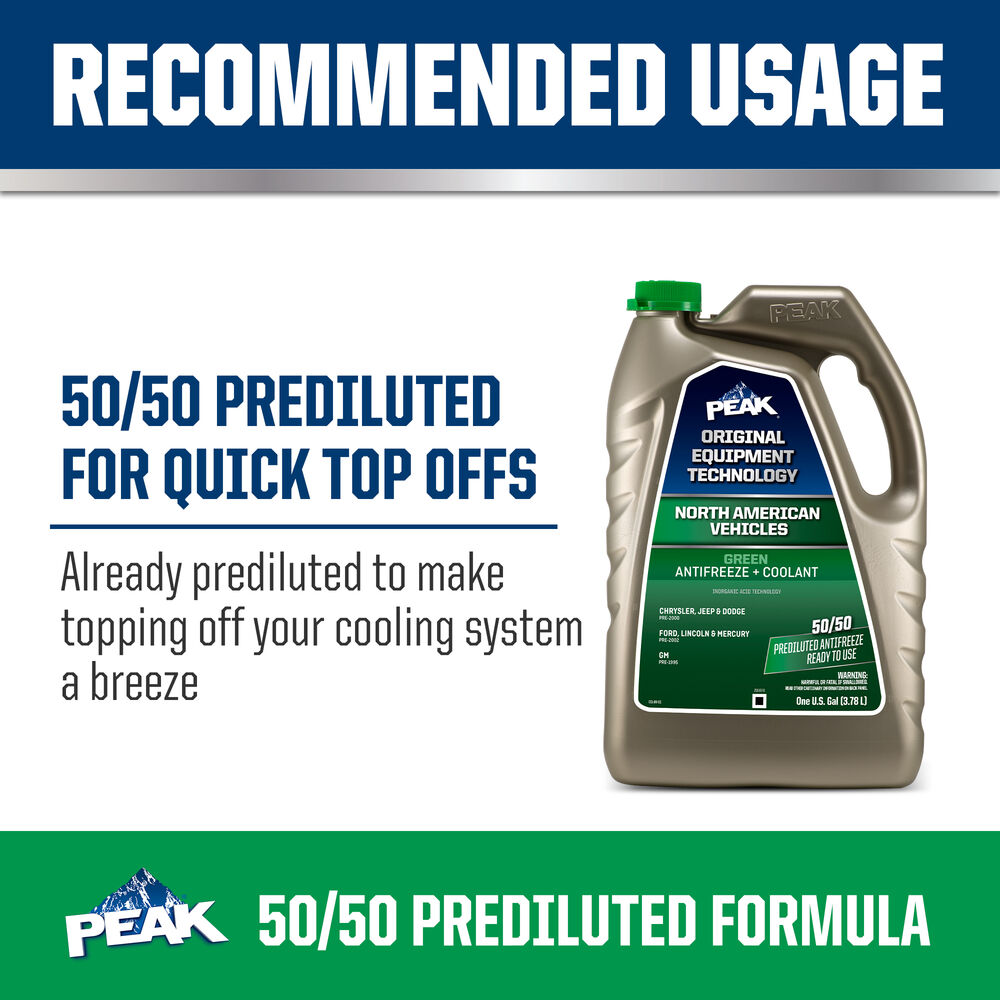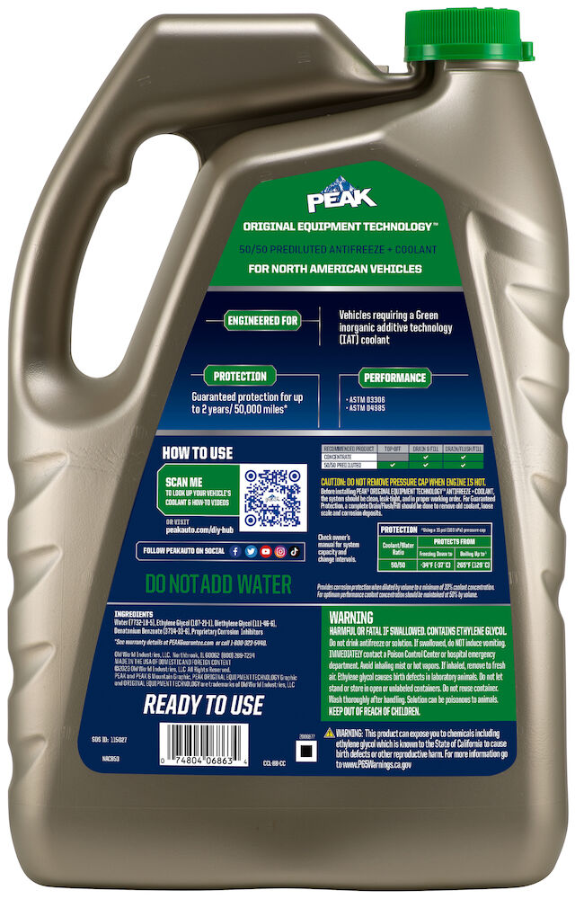 PEAK® ORIGINAL EQUIPMENT TECHNOLOGY™ ANTIFREEZE + COOLANT for NORTH AMERICAN VEHICLES - GREEN is a premium low silicate antifreeze/coolant based on proprietary conventional inorganic additive technology (IAT). Its ethylene glycol-based formula represents a carefully balanced mixture of inorganic corrosion inhibitors plus silicate stabilizer for complete protection of engines requiring a low silicate formulation. It is free from nitrite and amines and is compatible with non-metallic cooling system components. This product’s green color distinguishes its unique chemistry and ensures easy selection for North American vehicles requiring this type of technology and coolant color.