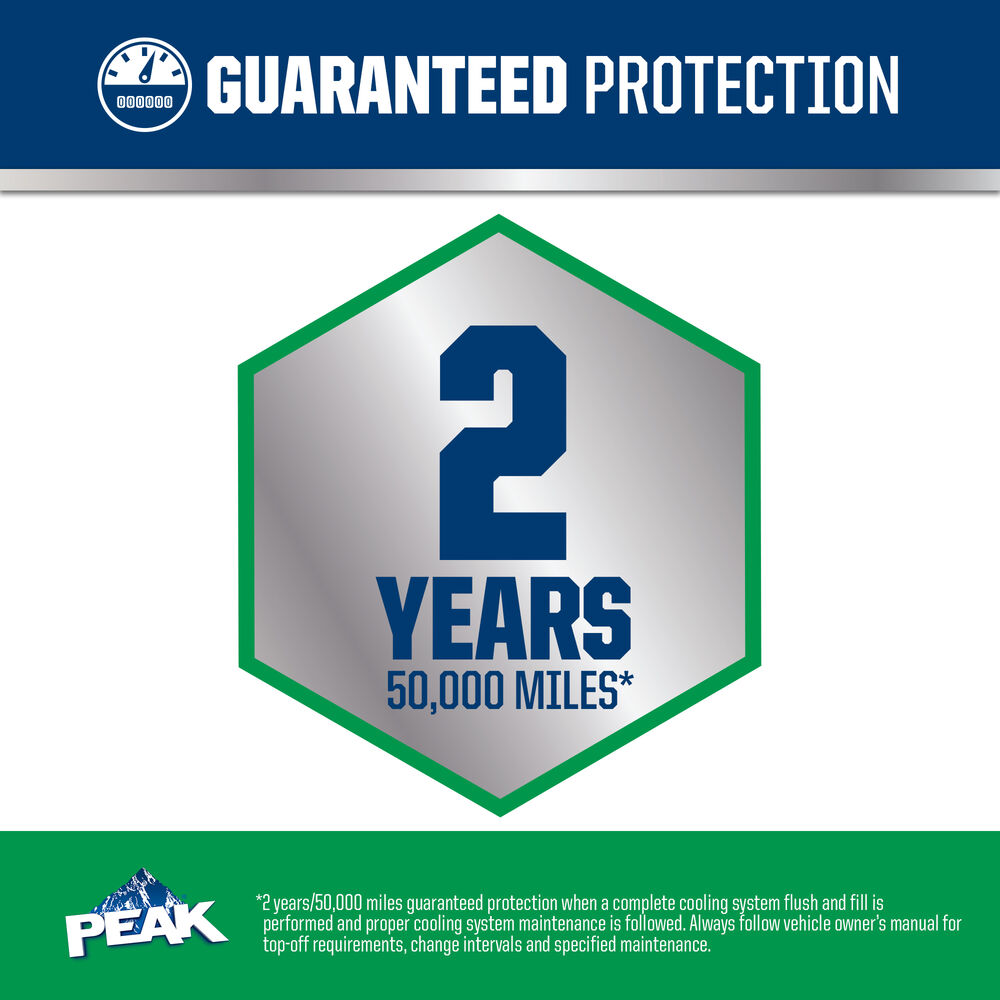 PEAK® ORIGINAL EQUIPMENT TECHNOLOGY™ ANTIFREEZE + COOLANT for NORTH AMERICAN VEHICLES - GREEN is fully compatible with other green conventional coolants and meets the performance requirements of ASTM D3306 and D4985. With a complete flush and fill, PEAK guarantees this coolant will provide the service life specified by the OEMs utilizing this specific technology, up to 2 years or 50,000 miles*.