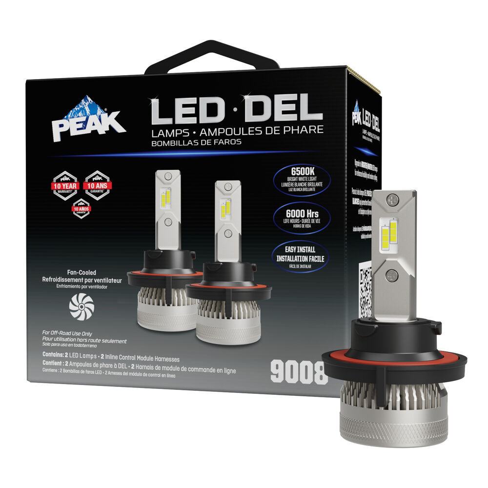 Light up the road with confidence. PEAK® LED Fog Lamps are designed to easily replace your factory fog lights*, giving you a powerful upgrade with up to 2,800 lumens of bright white light. Each set includes two lamps with built-in control modules that keeps the brightness steady and prevents the lamps from overheating.