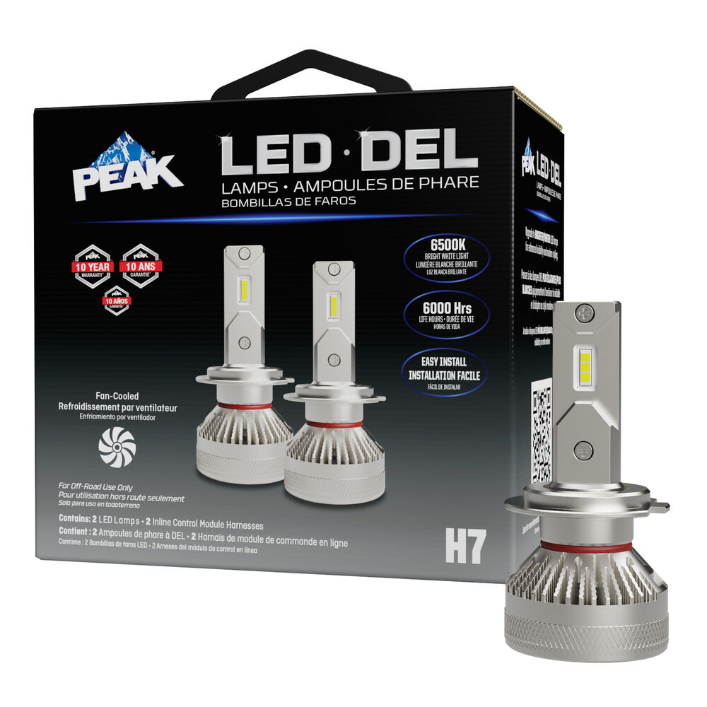 Light up the road with confidence. PEAK® LED Fog Lamps are designed to easily replace your factory fog lights*, giving you a powerful upgrade with up to 2,800 lumens of bright white light. Each set includes two lamps with built-in control modules that keeps the brightness steady and prevents the lamps from overheating.