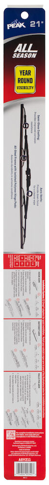 PEAK® ALL SEASON wiper blades provide year round visibility and are constructed with a durable all steel frame for a longer service life. These wiper blades deliver reliable performance and provide a smooth clean wipe for clear visibility. ALL SEASON wiper blades have a pre-attached EZ-SNAP® Universal Connector System that fits Hook, Side Lock, and Bayonet wiper arms directly. Installation is quick and easy with simple to follow instructions printed on the package. Blades are available in lengths of 12” to 28”.
