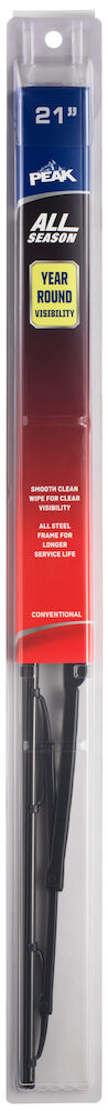 PEAK® ALL SEASON wiper blades provide year round visibility and are constructed with a durable all steel frame for a longer service life. These wiper blades deliver reliable performance and provide a smooth clean wipe for clear visibility. ALL SEASON wiper blades have a pre-attached EZ-SNAP® Universal Connector System that fits hook, bayonet, male pin, and side lock wiper arms directly. Installation is quick and easy with simple to follow instructions printed on the package. Blades are available in lengths of 12” to 28”.