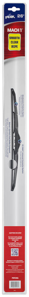 PEAK® MACH1™ hybrid wiper blades provide a smooth clear wipe in all weather conditions. These hybrid blades combine the stability of a conventional blade with the sleek design and performance of a beam blade. MACH1™ hybrid wiper blades are equipped with EZ-SNAP® Universal Connector System to fit most wiper arm styles. Installation is quick and easy with simple to follow instructions inside the package. Blades are available in lengths 16” to 28”.