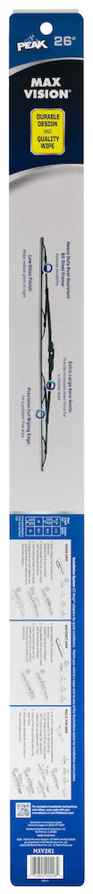 PEAK® MAX VISION® conventional wiper blades are engineered with a durable design to provide a quality wipe and maximum driving visibility, no matter the driving conditions. This wiper blade is a premium conventional style wiper blade designed with a long lasting, all-metal, rust-resistant frame to ensure durability over the lifetime of the blade. This wiper blade delivers great cleaning and visibility to see the road ahead. MAX VISION® wiper blades have a pre-attached EZ-SNAP® Universal Connector System that fits Hook, Side Lock, and Bayonet wiper arms directly. Installation is quick and easy with simple to follow instructions printed on the package. Blades are available in lengths of 12” to 28”.