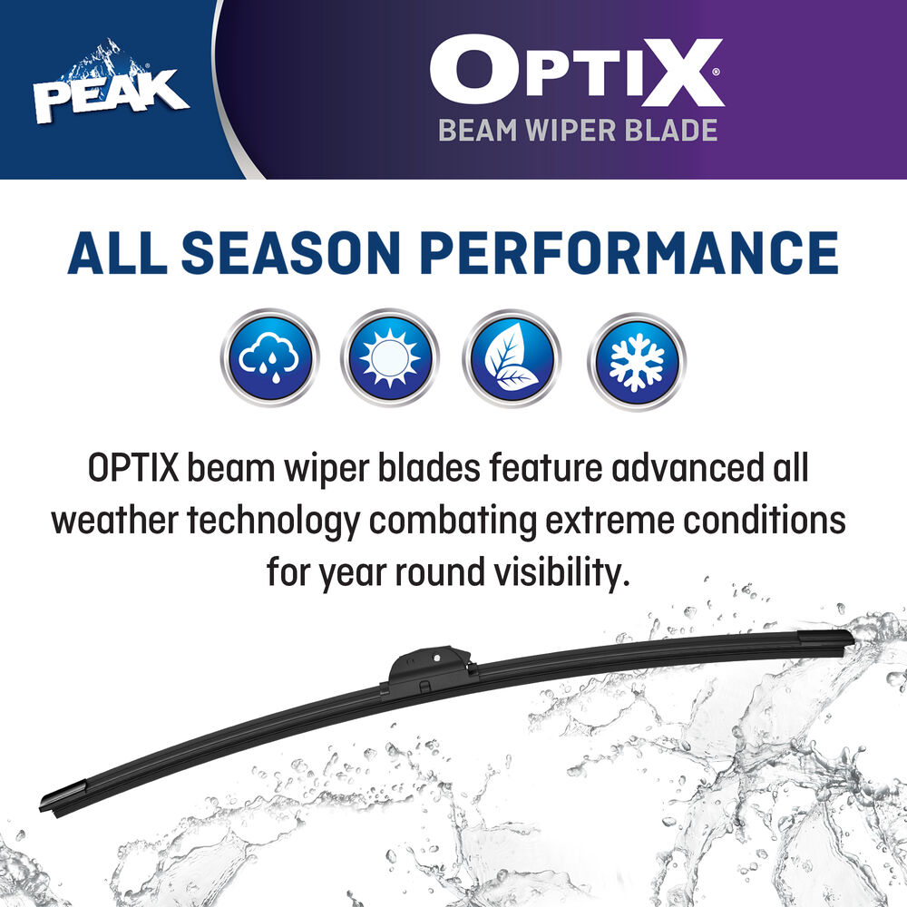 PEAK® OPTIX® beam wiper blades are uniquely engineered for 2X durability* with its heavy-duty aerodynamic spoiler design and long-lasting dual synthetic rubber. The beam blade technology evenly distributes pressure across the entire wiping element to hug the windshield for exceptional cleaning power. OPTIX beam wiper blades also feature advanced all weather technology combating extreme conditions for year round visibility. PEAK OPTIX beam wiper blades are equipped with EZ-SNAP® Universal Connector System which fits most wiper blade arms. Installation is quick and easy with simple to follow instructions inside packaging. Blades are available in lengths of 13" to 28".