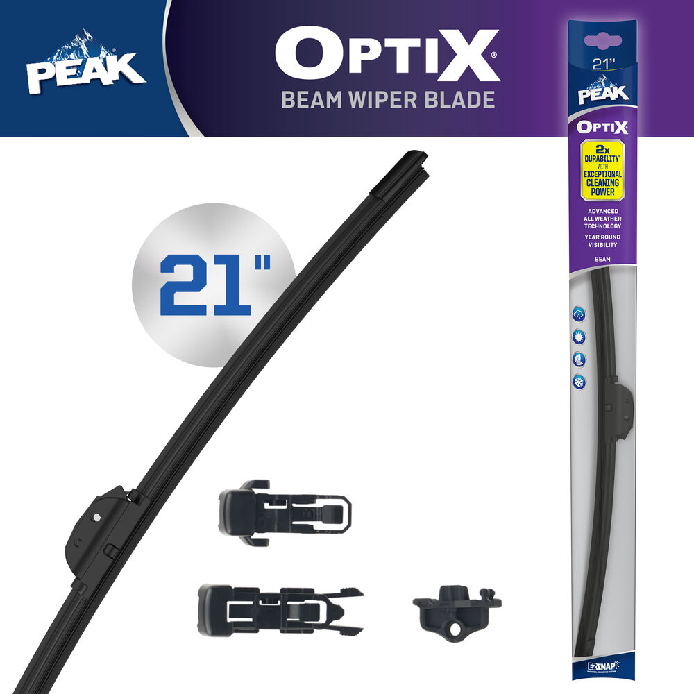 PEAK® OPTIX® beam wiper blades are uniquely engineered for 2X durability* with its heavy-duty aerodynamic spoiler design and long-lasting dual synthetic rubber. The beam blade technology evenly distributes pressure across the entire wiping element to hug the windshield for exceptional cleaning power. OPTIX beam wiper blades also feature advanced all weather technology combating extreme conditions for year round visibility. PEAK OPTIX beam wiper blades are equipped with EZ-SNAP® Universal Connector System which fits most wiper blade arms. Installation is quick and easy with simple to follow instructions inside packaging. Blades are available in lengths of 13" to 28".