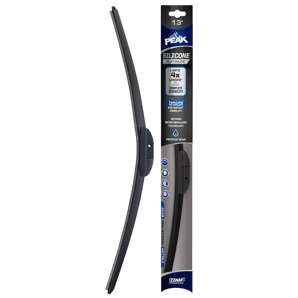 PEAK® SILICONE PLATINUM™ is our premium top-of-the-line beam wiper blade, engineered to last 4X longer and delivers complete visibility throughout every season. The Quad-layered wiping element technology is constructed with a silicone compound for longevity, providing 2 million problem-free wipers* during the life of the blade. The infused water repellent technology coats the windshield, shedding rain and winter road spray. Use of TalcLife™ Technology, a proprietary talcum coating, ensures the smoothest possible wipe. Upgrade to a high-end wiper blade that endures through all season with PEAK® SILICONE PLATINUM™ wiper blades. These blades are equipped with EZ-SNAP® Universal Connector System to fit most wiper arm styles. Installation is quick and easy with simple to follow instructions inside the package. Blades area available in lengths of 13" to 28".